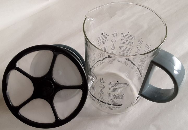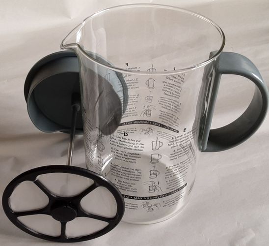 bodum Milchaufschäumer Latteo 1366-1 Glas, Deckel und Griff grau Maße: H am Ausguss 14 cm, insgesamt 19cm, Vol.1 L max. Füllhöhe: 250 ml Gebrauchsanleitung in D, E, I, F, DK, GB (am Glas) gebraucht, selten benutzt, wie neu