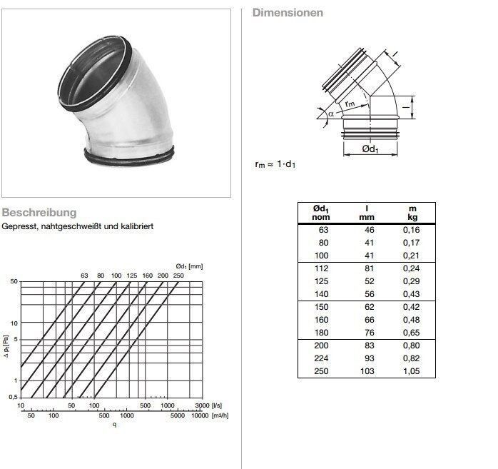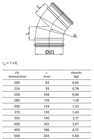 Bogen Winkel 45° NW 80-450mm Lippendicht. Wickelfalzrohr/ Aluflexrohr