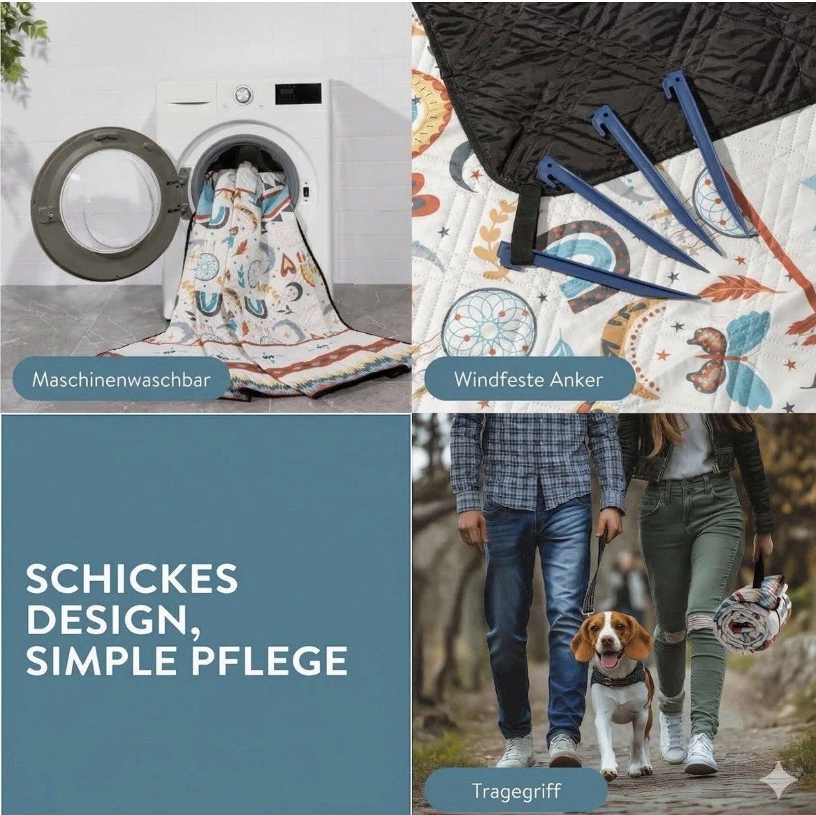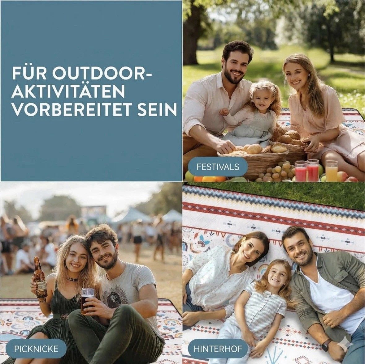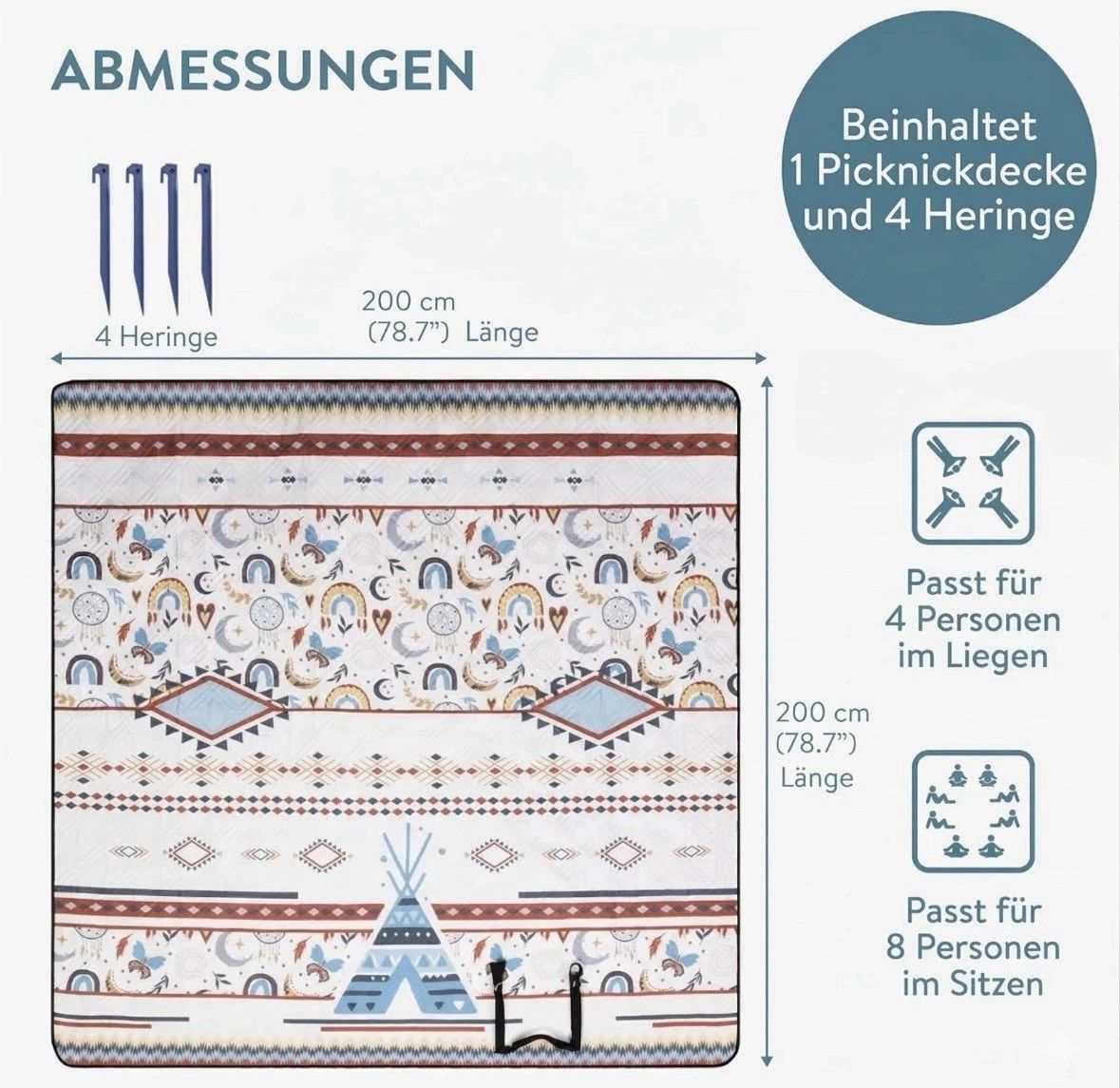 Boho Picknickdecke 200x200 groß XXL Outdoor Strand Decker wasserdicht Jemidi