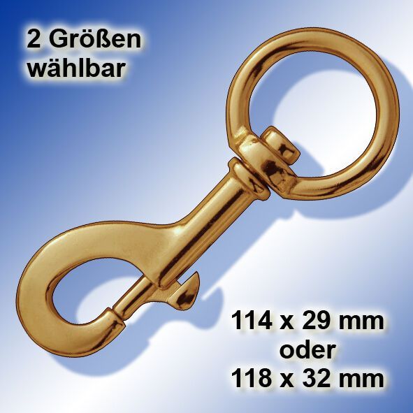 Artikel: Bolzen-Karabinerhaken 114 x 29 mm Artikel-Nr.: 8650.30.000.29 Ausführung: mit drehbarem und rundem Wirbel Material: Messing Größe: 114 x 29 mm (1-1 8 ) Länge: 114 mm Breite: 29 mm oder Artikel: Bolzen-Karabinerhaken 118 x 32 mm Artikel-Nr.: 8650.30.000.32 Ausführung: Karabiner mit drehbarem