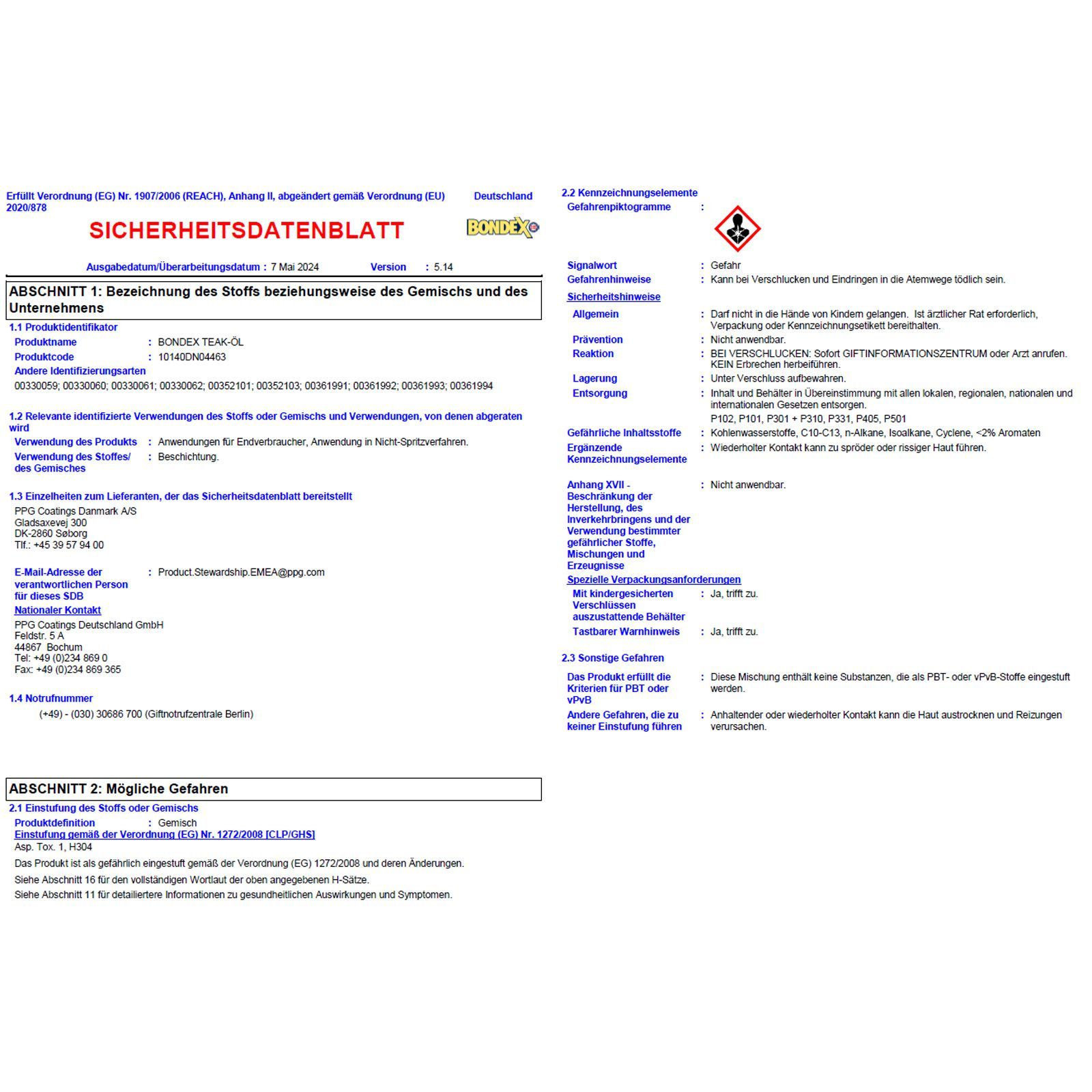 • Kann bei Verschlucken und Eindringen in die Atemwege tödlich sein.