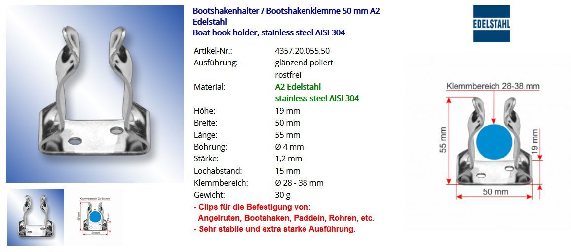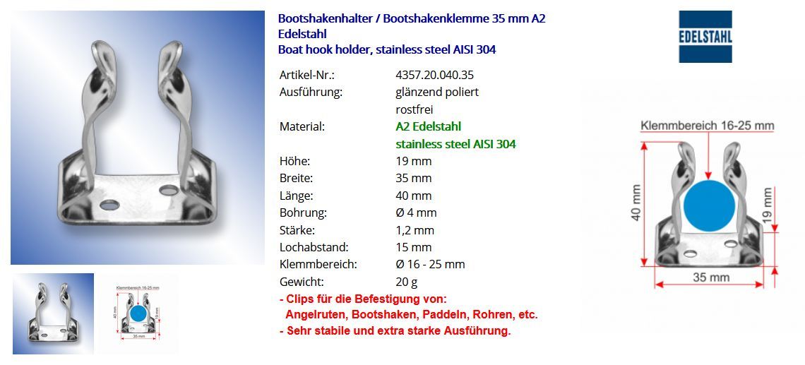 Bootshakenhalter Bootshakenklemme Ø 16-25 mm Ø 28-38 mm A2 Edelstahl Niro Boot