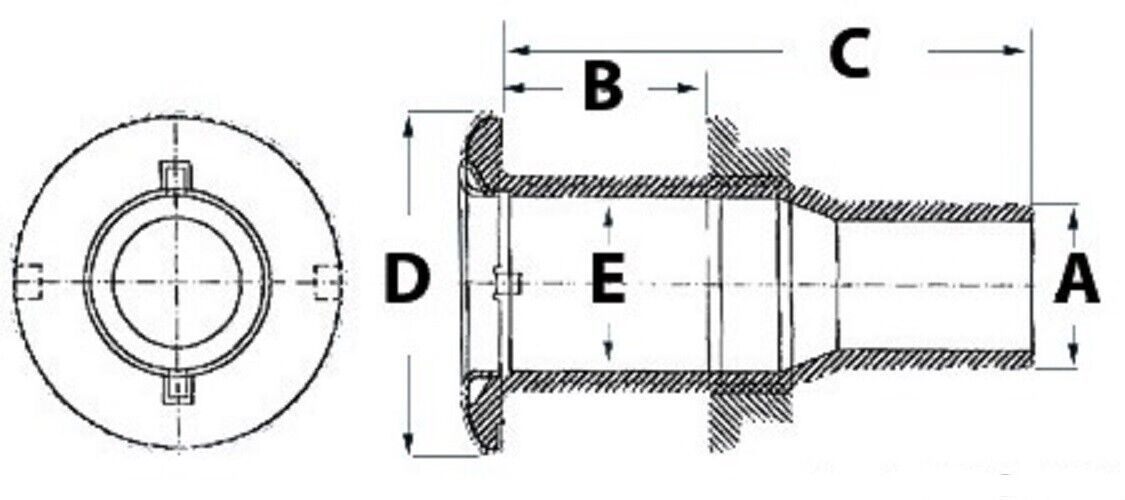 Borddurchlass Aus schwarzem Naylon. Blende aus hochglanzpoliertem, rostfreiem Edelstahl. Normal 0 21 false false false DE X-NONE X-NONE Schl.Anschl. A in Zoll Schl.-Anschl. A in mm Durchschitt Gewinde E in Zoll Durchschitt Gewinde E in mm B in mm C in mm D in mm 1 2“ 13 7 8“ 22 32 82,5 38 5 8“ 16 7