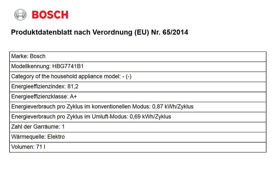 Bosch, HBG7741B1 Serie 8, Einbau-Backofen, 60 x 60 cm, Schwarz ,EEK:A+ Backofentyp und Heizart Backofen mit 14 Beheizungsarten: 3D Heißluft, Ober- Unterhitze, Umluftgrill, Großflächengrill, Kleinflächengrill, Pizzastufe, Unterhitze, Sanftgaren, Auftauen, Vorwärmen, Warmhalten, Heißluft sanft, Ober- ... Mehr