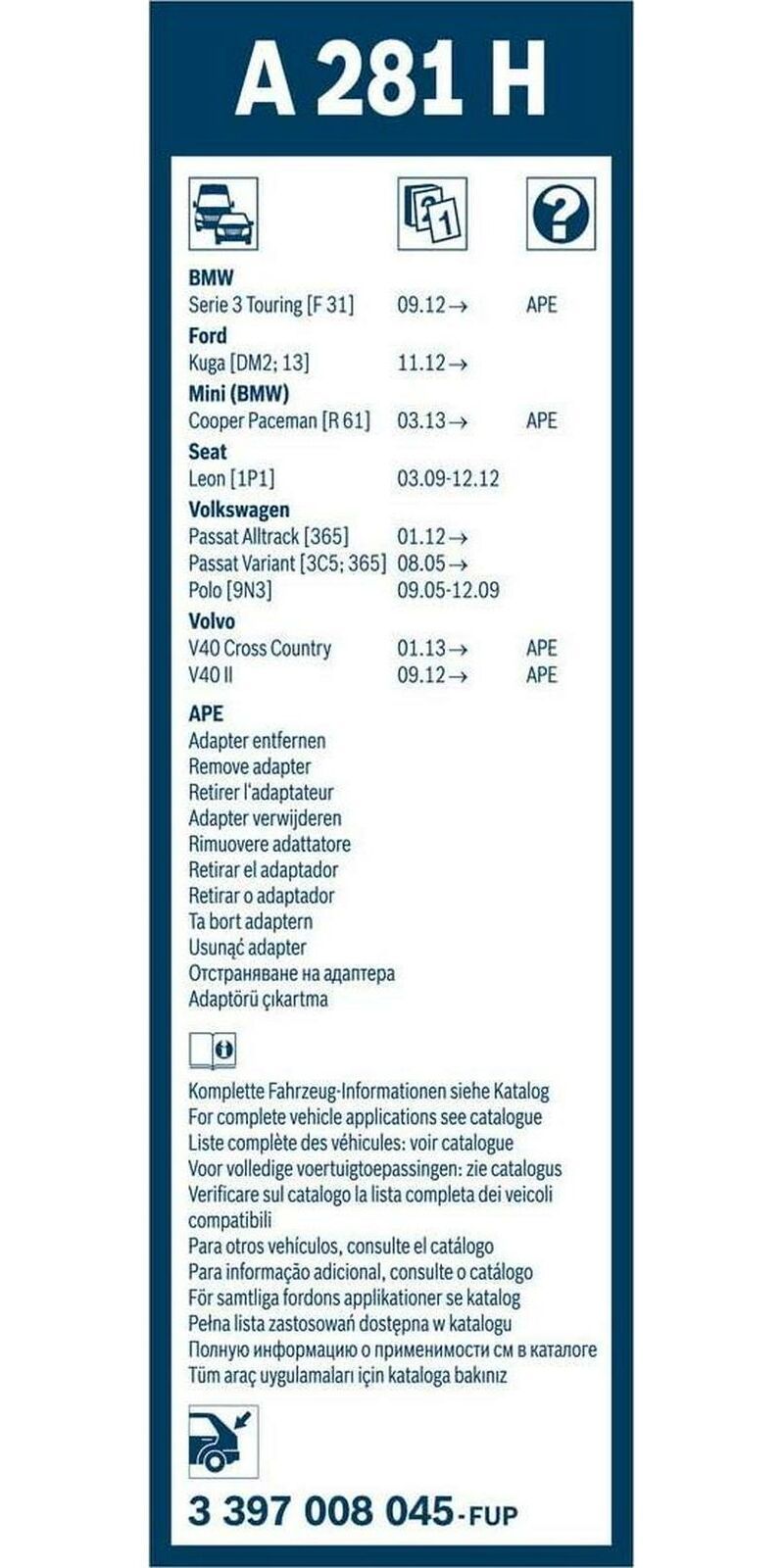 Bosch Kfz Pkw Scheibenwischer Rear Hinten Heckscheibe A281H Länge 280 mm 11 Zoll