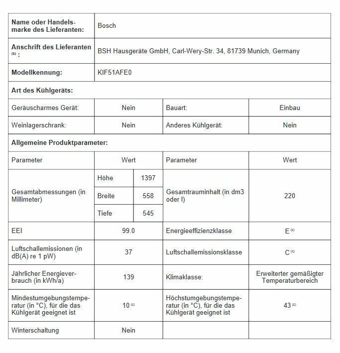 Bosch Bosch, KIF51AFE0 Einbau-Kühlschrank 140 x 56 cm , EEK: E