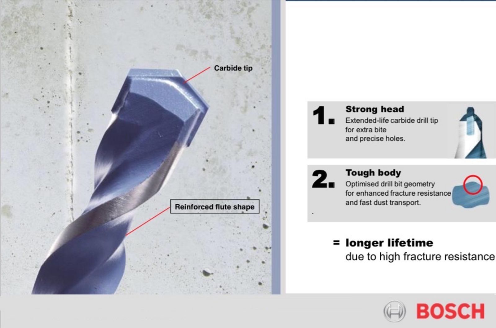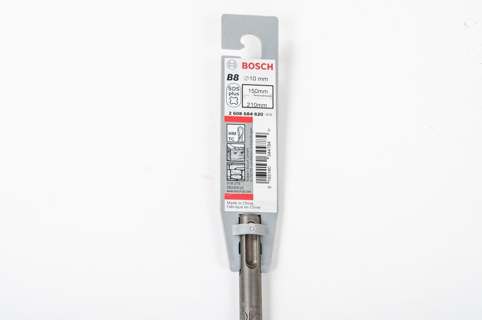 Bosch SDS Plus Bohrer B8 • Hartmetall-Spitze sorgt für eine verlängerte Lebensdauer sowie für mehr Biss und Präzision • Optimierte Bohrergeometrie für erhöhte Bruchfestigkeit und schnellem Staubtransport • Geeignet für Beton/Stein • Passt in alle Bohrhämmer mit SDS-Plus Aufnahme • Wählbar in verschiedenen Größen (Durchmesser x effektive Länge x Gesamtlänge)
