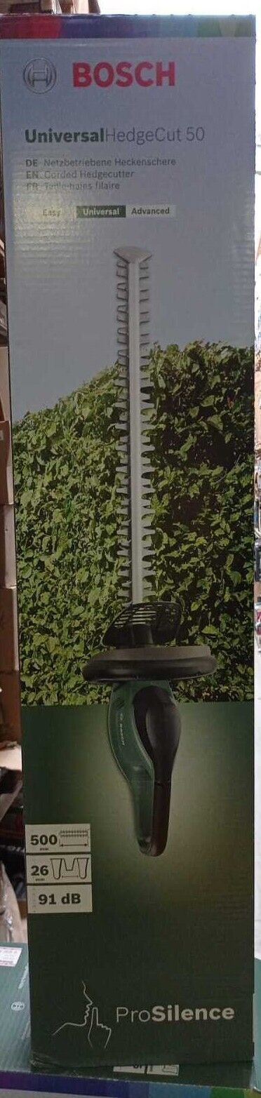 Bosch Elektro-Heckenschere HedgeCut 50 50 cm Schnittlänge Optimale Leistung und 80 % leiser: zum Trimmen mittelgroßer Hecken Die kabelgebundene Universal Hedgecut 50 eignet sich perfekt zum problemlosen geräuscharmen Trimmen mittelgroßer Hecken. In dem geräuschdämpfenden Gehäuse ProSilence 91 dB ist