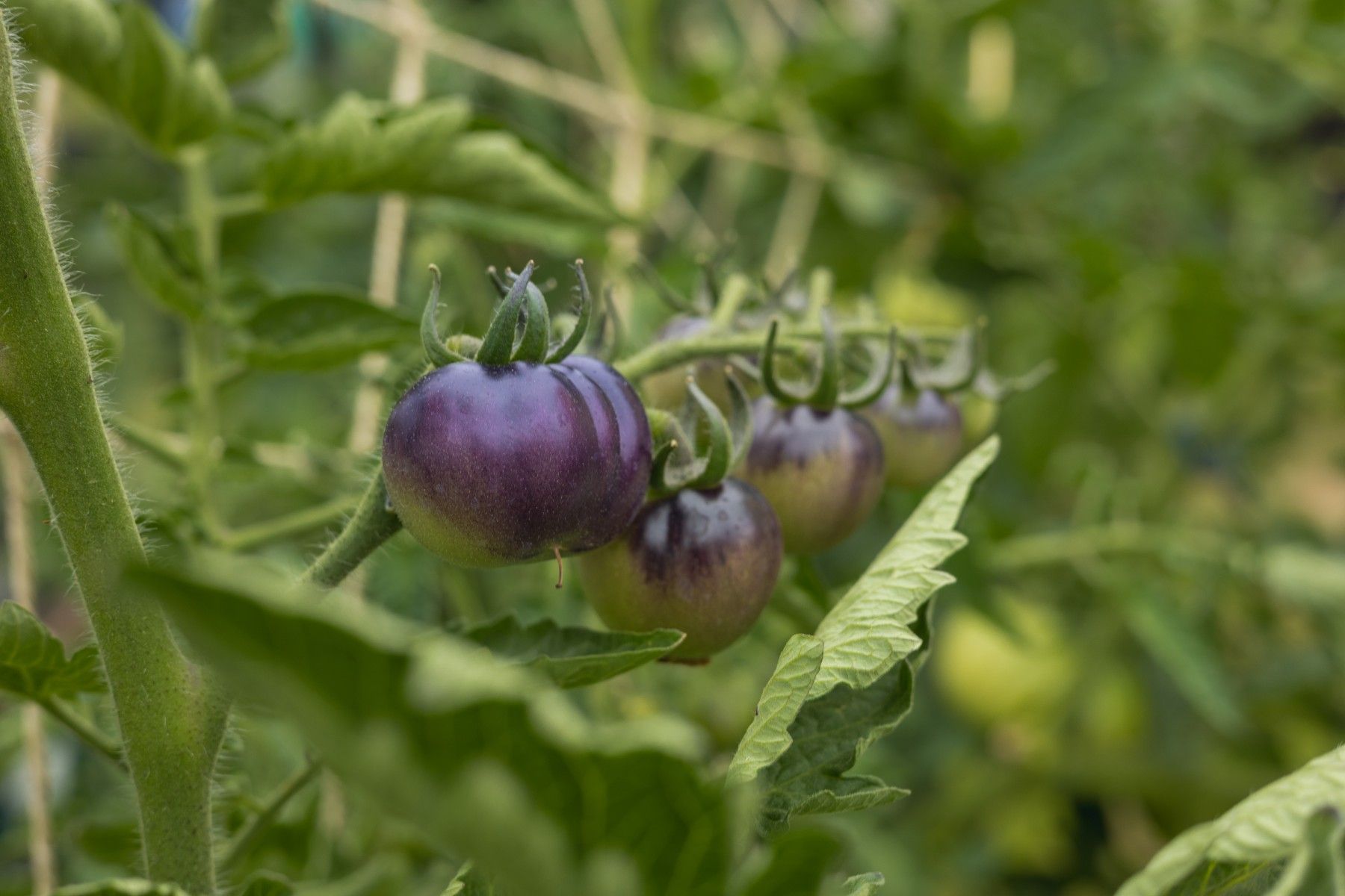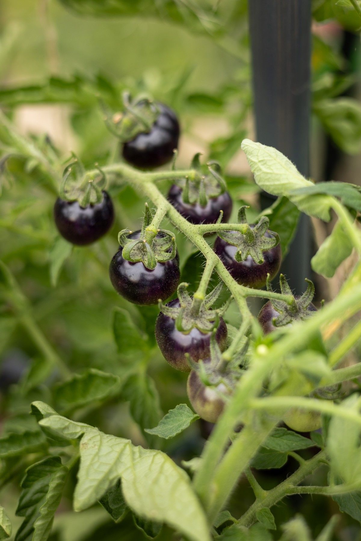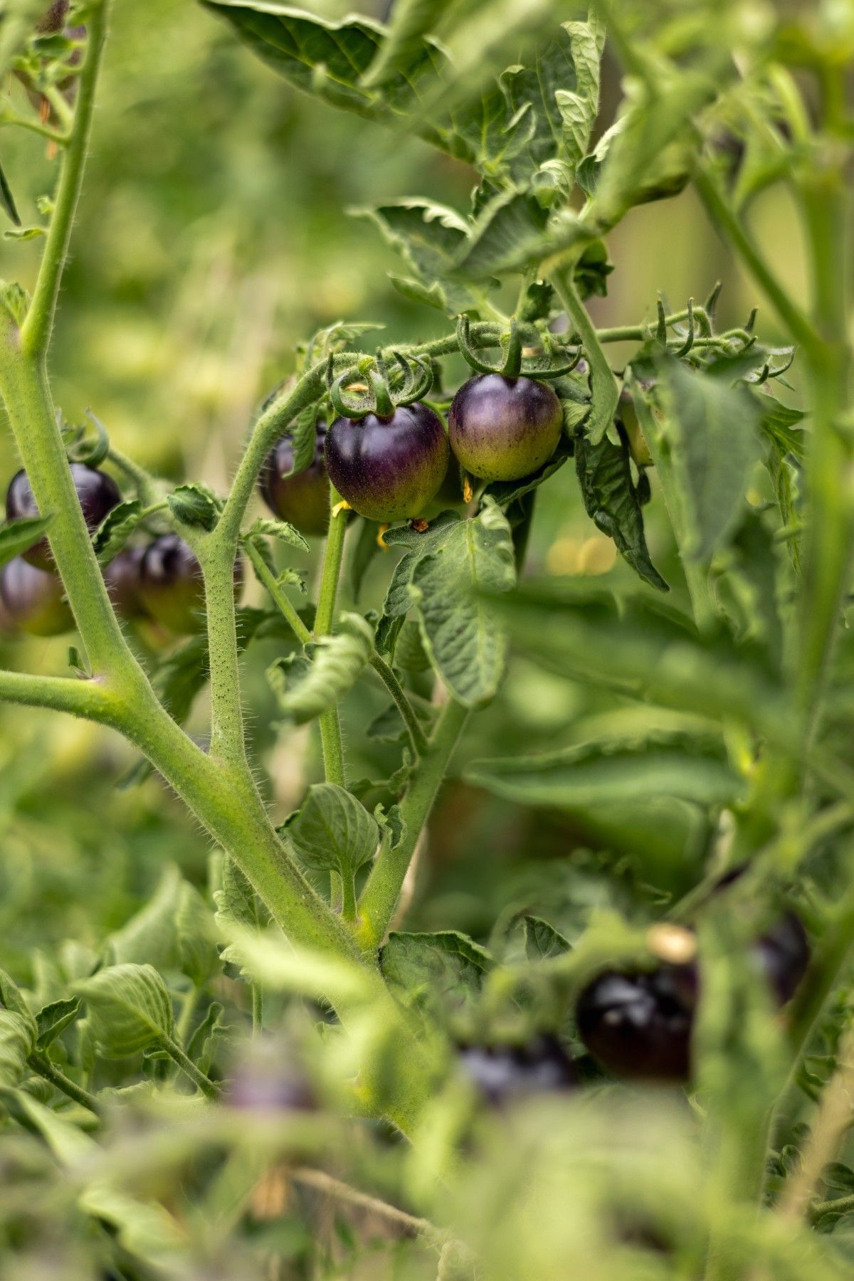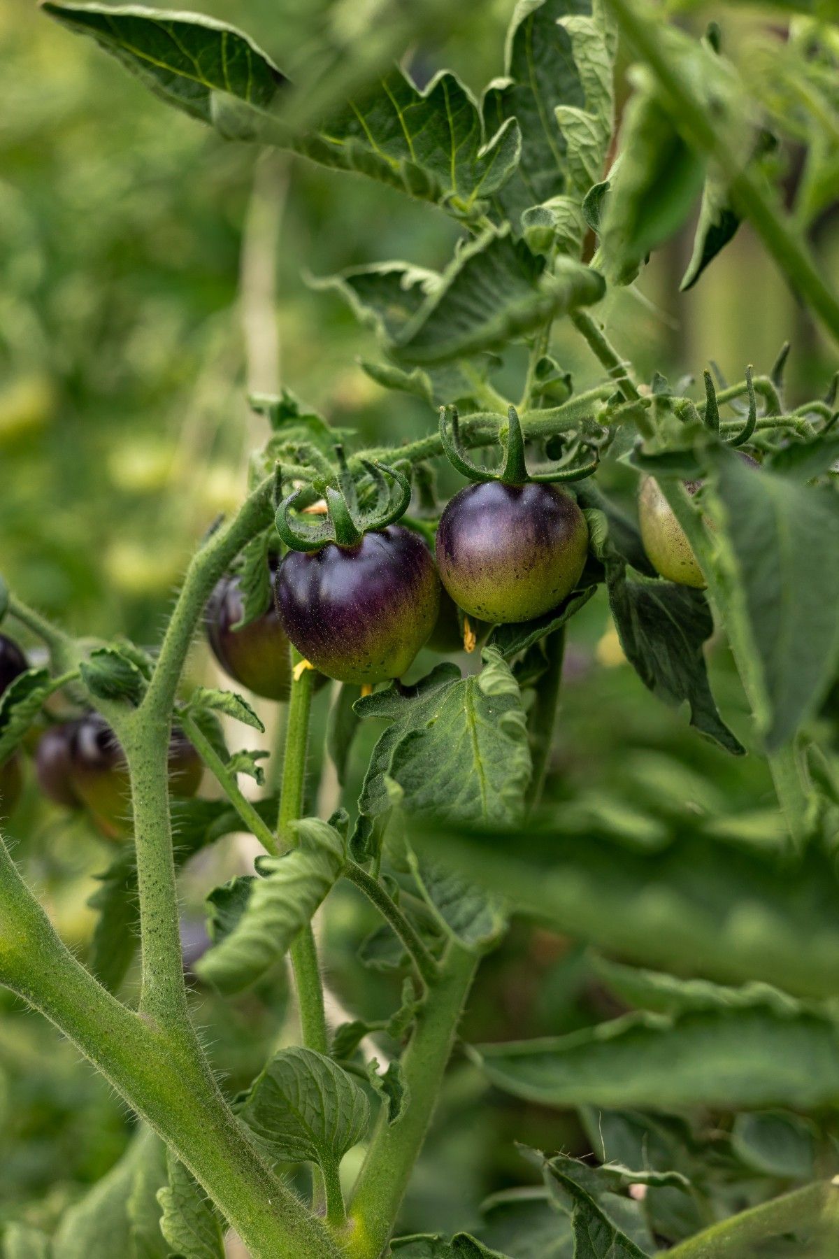 Erleben Sie die Schönheit und den Geschmack der "Bosque Blue Bumblebee" Tomate, eine bemerkenswerte Sorte mit einer überraschenden Farbgebung und köstlichem Aroma. Die Früchte dieser Sorte sind mittelgroß und zeichnen sich durch ihre tiefblaue bis fast schwarze Haut aus, die ein wahres Highlight in Ihrem Garten darstellt. Im reifen Zustand verbirgt sich unter der dunklen Schale saftiges, gelbes Fruchtfleisch von außergewöhnlicher Süße und einem Hauch von Würze.
