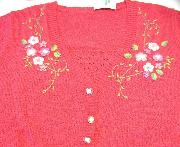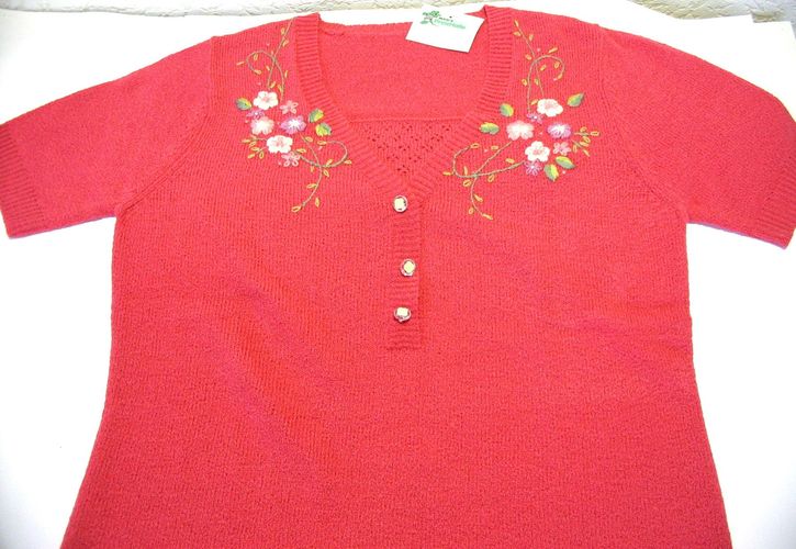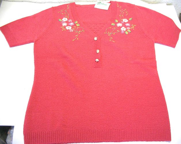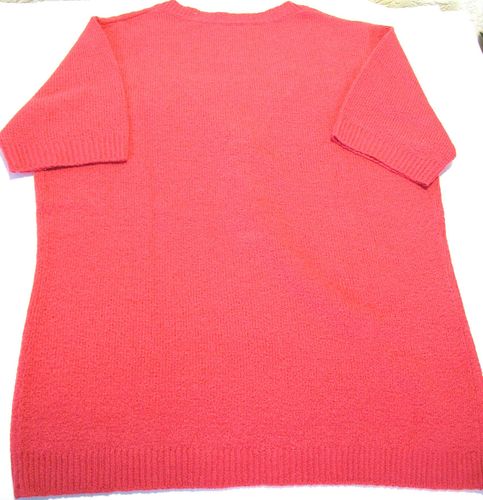 Bouclé-Strickpulli in pink-bunt mit Blumenstickerei und Zierknopfleiste kurzärmlig fällt etwa aus wie Gr. 40 - bitte Maße unten beachten ! (Es ist leider kein Größenschild vorhanden.) Zustand: Neu mit Etikett klassischerer, ganz leicht taillierter Schnitt Maße: Weite von Achsel zu Achsel: ca. 50 cm