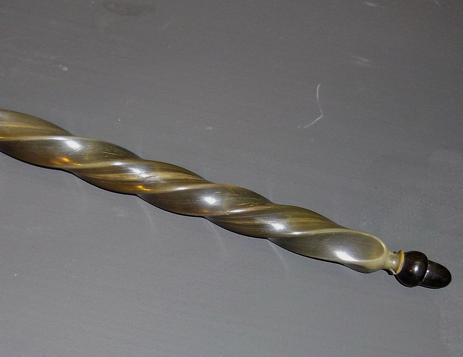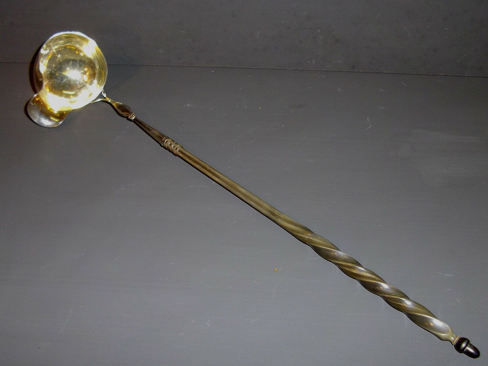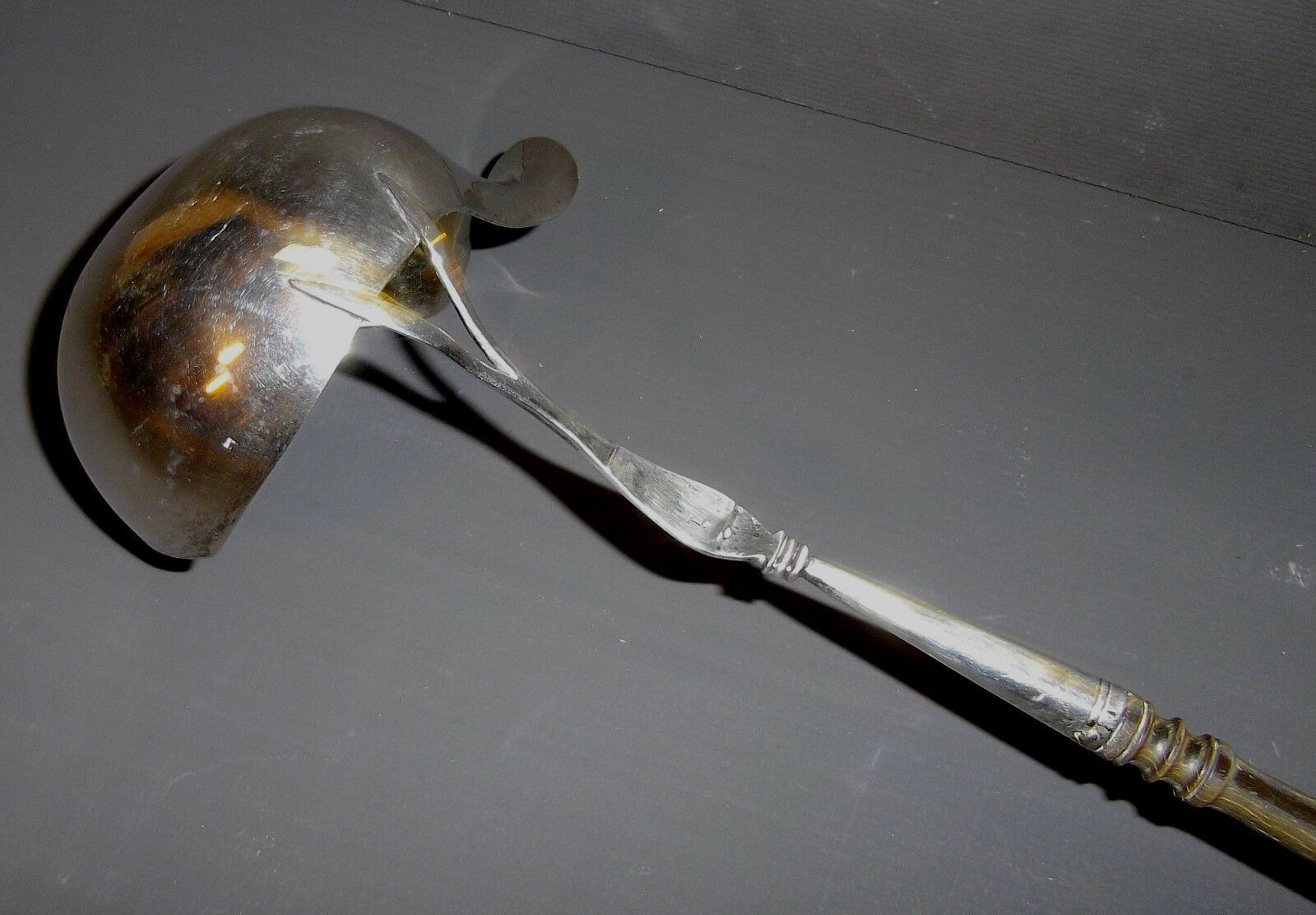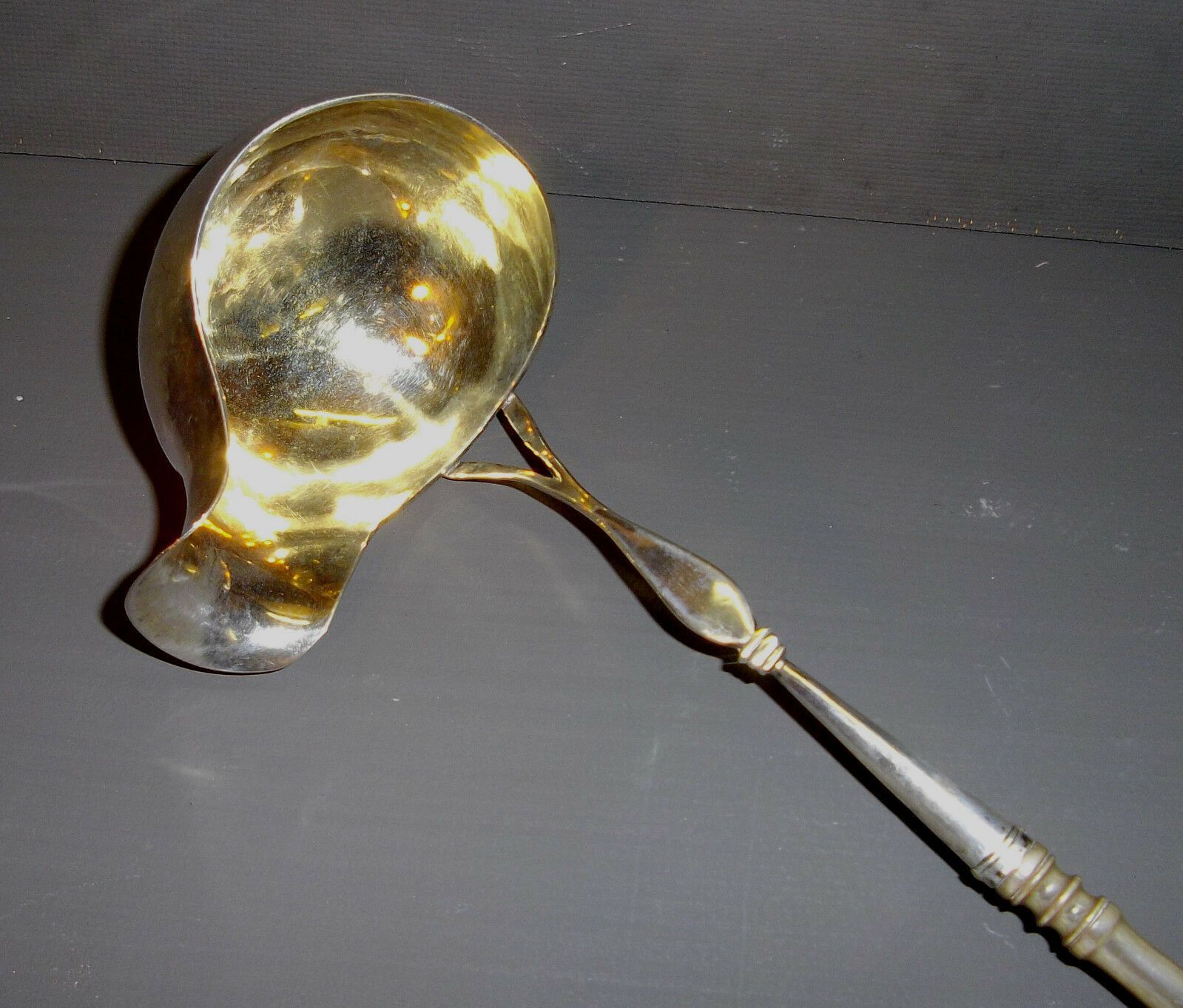 Bowlekelle von 1858 (Biedermeier). Material: Silber, innen vergoldet, Griff Horn. Ohne Marke: (siehe Foto). Inschrift: D.Schulz 1858 . Sehr schönes, gut erhaltenes Stück! Maße: L 45 cm. Antikes am Deich - Inh: Oliver Kipp-Trense