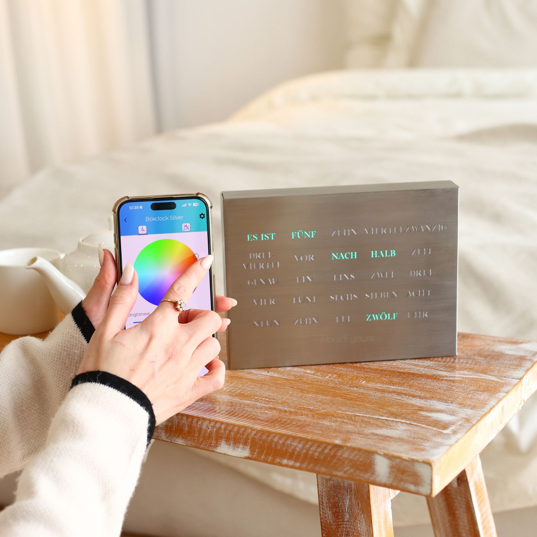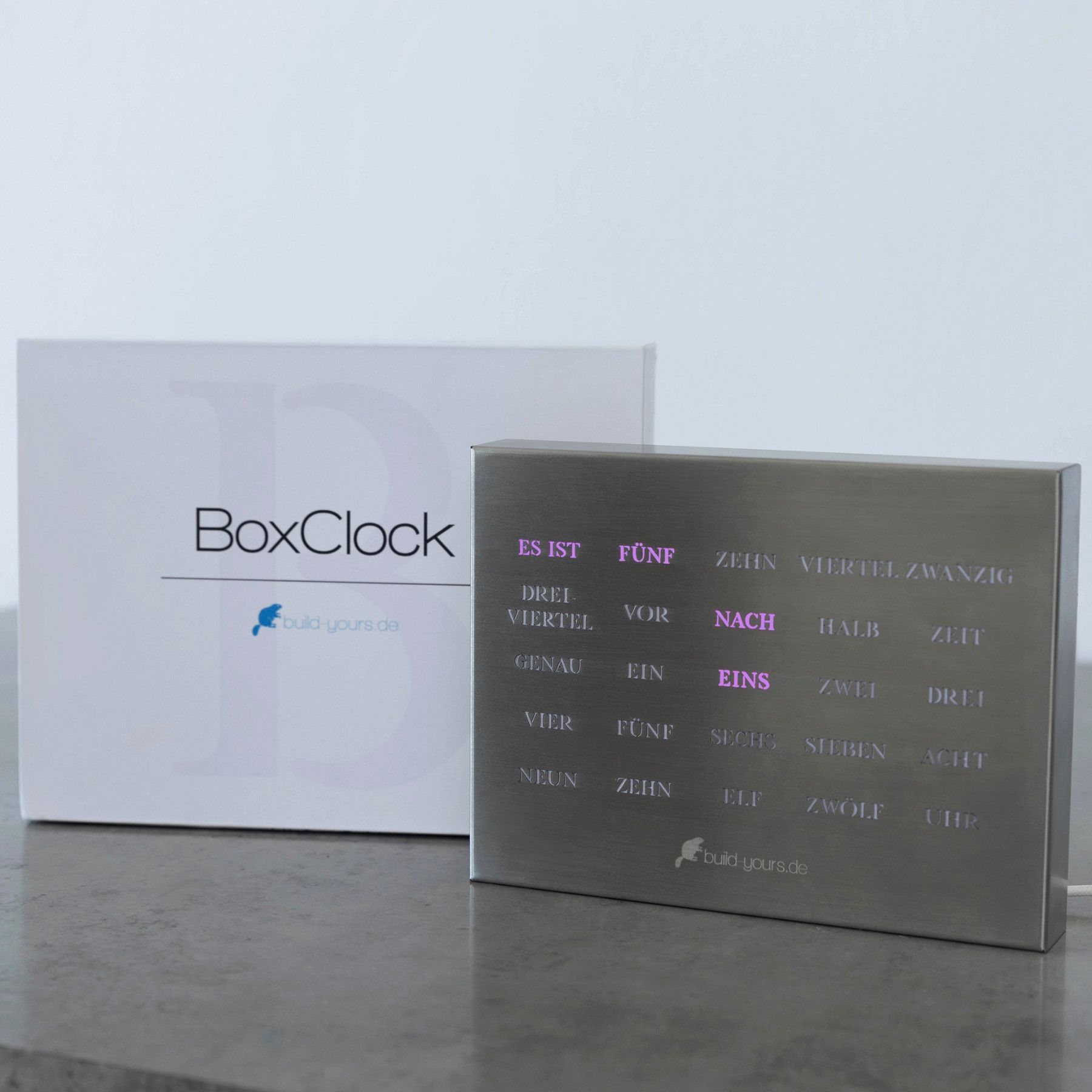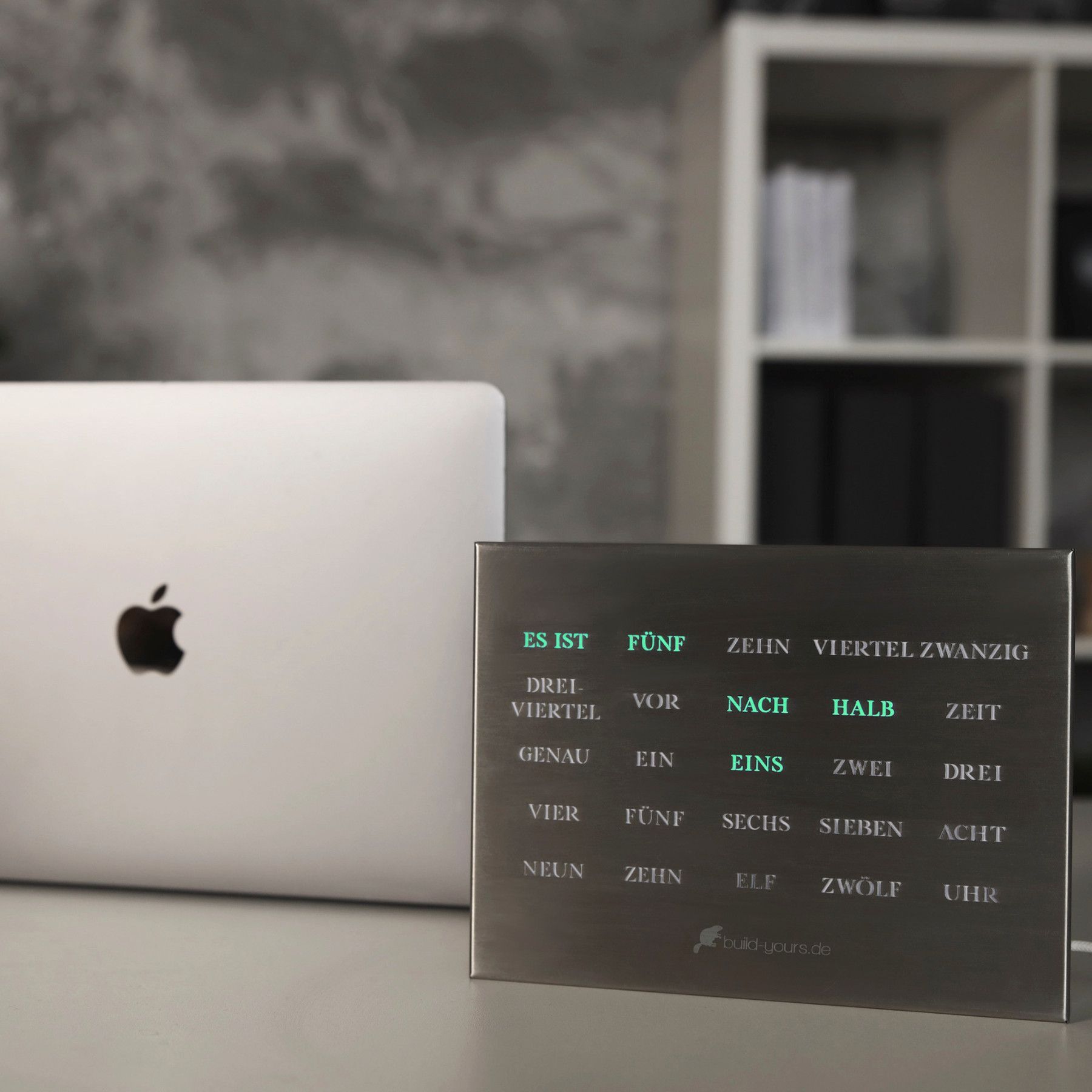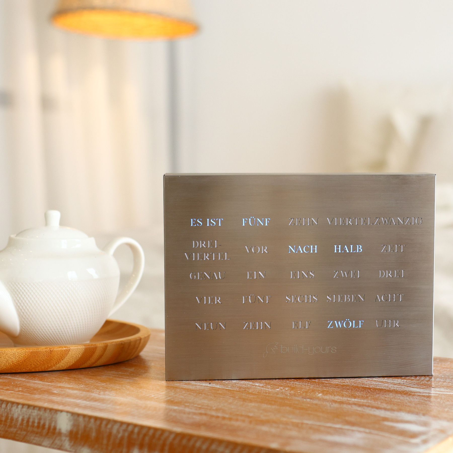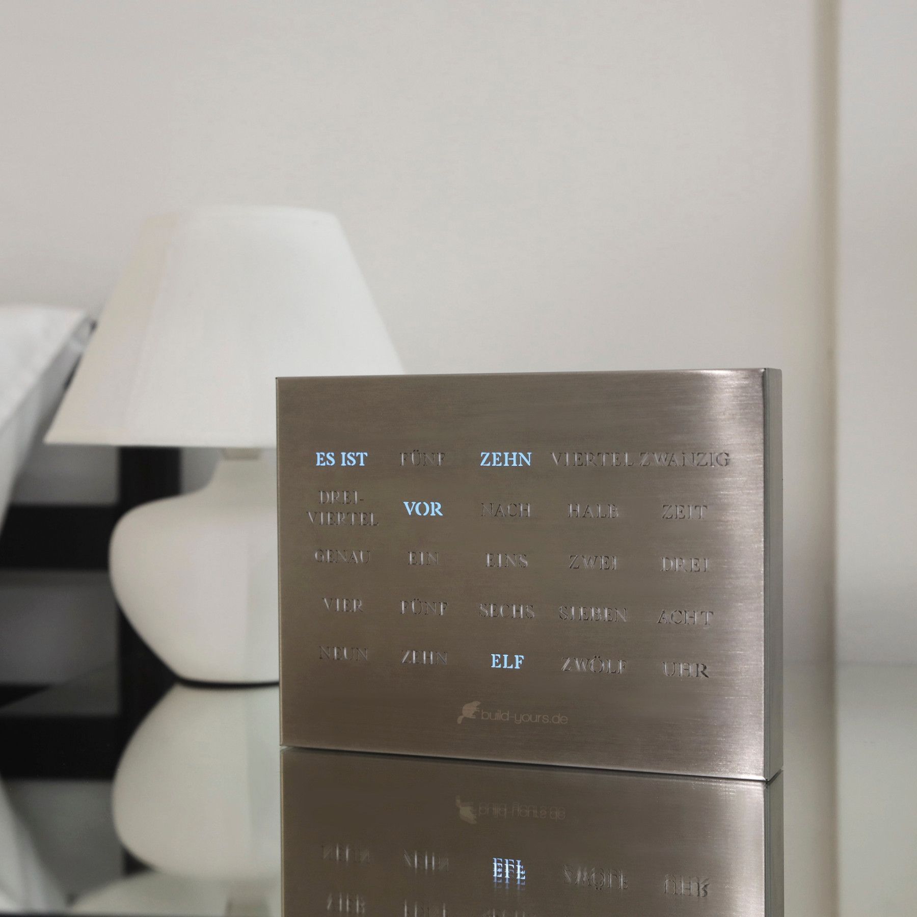 BoxClock Edelstahl - Die Wortuhr für den Schreibtisch - LED Tischuhr - Standuhr