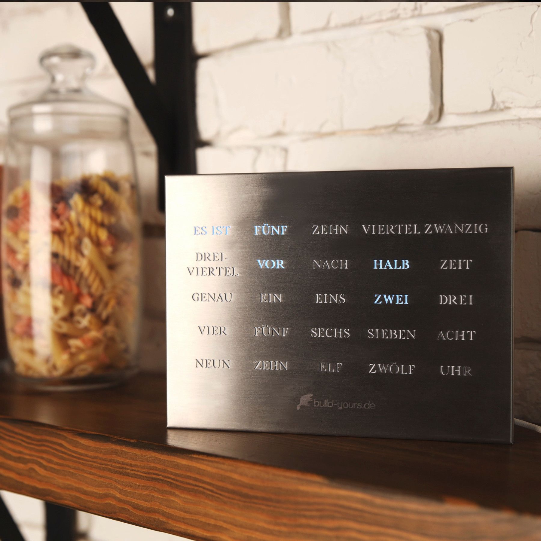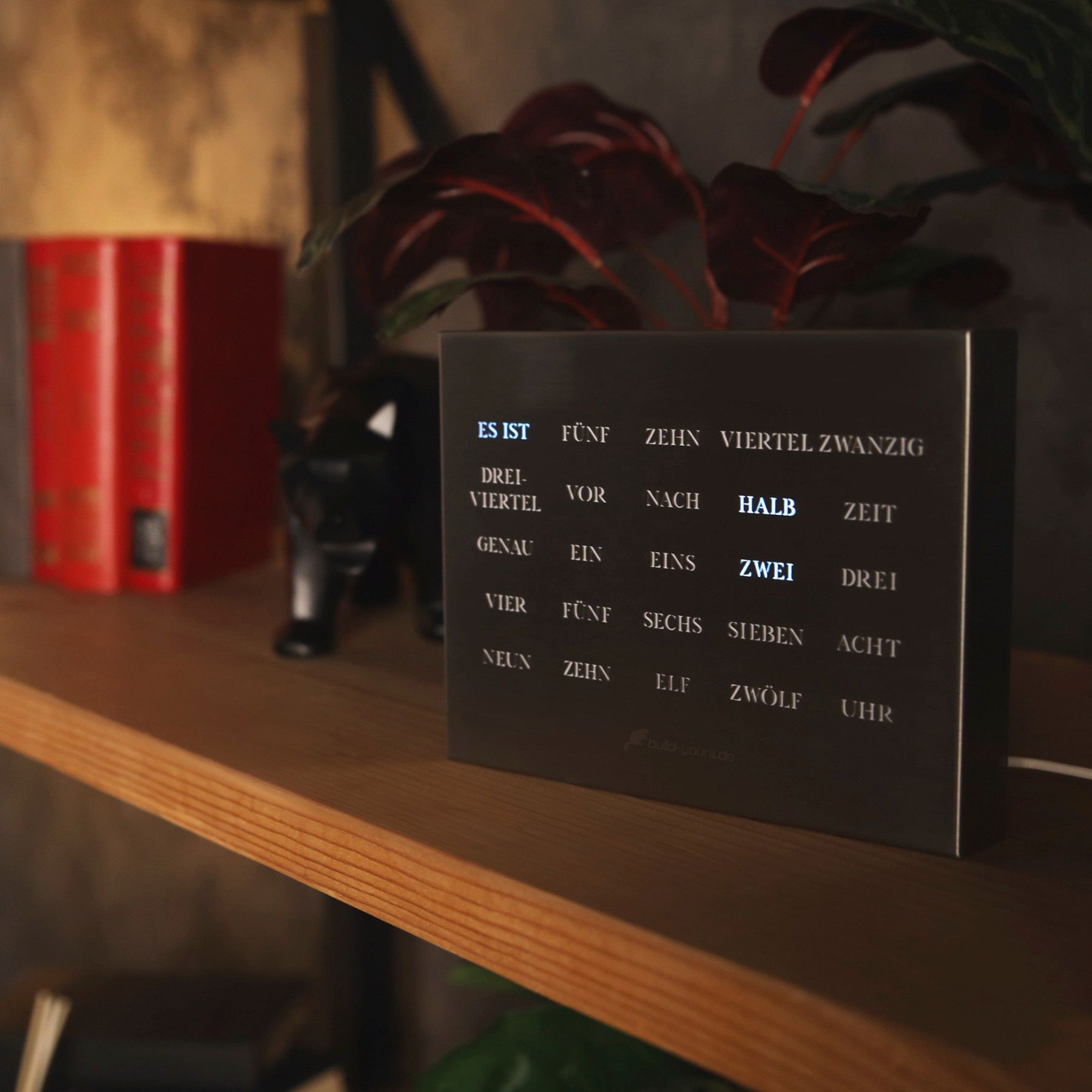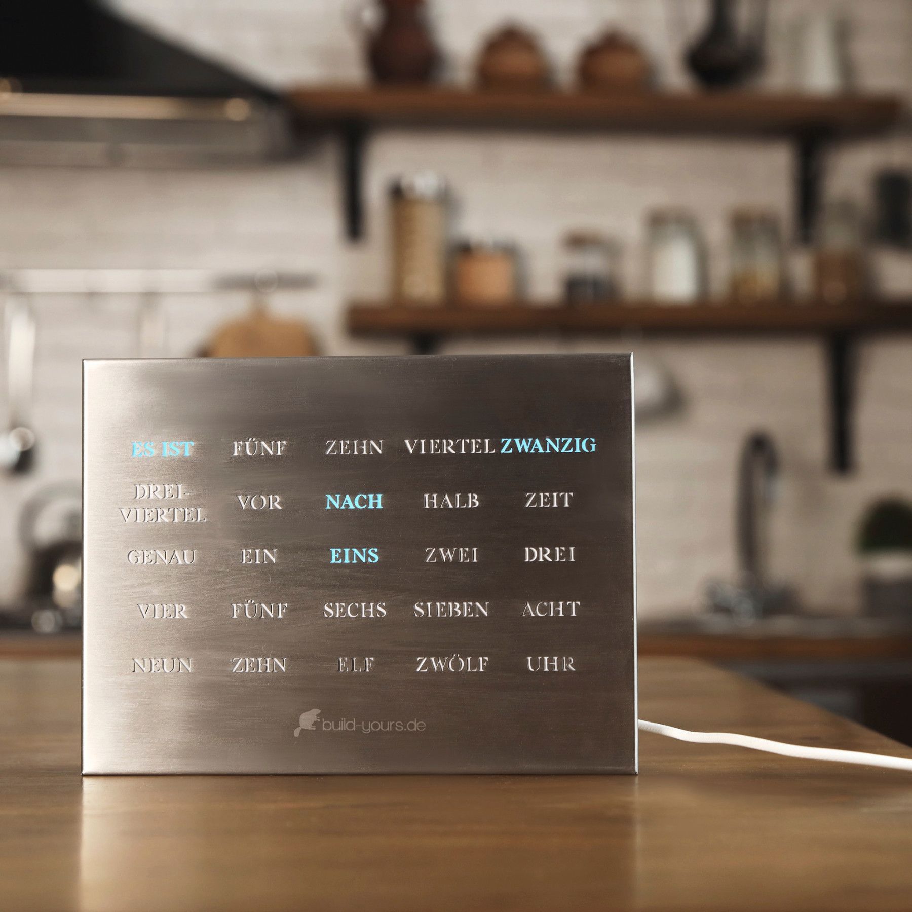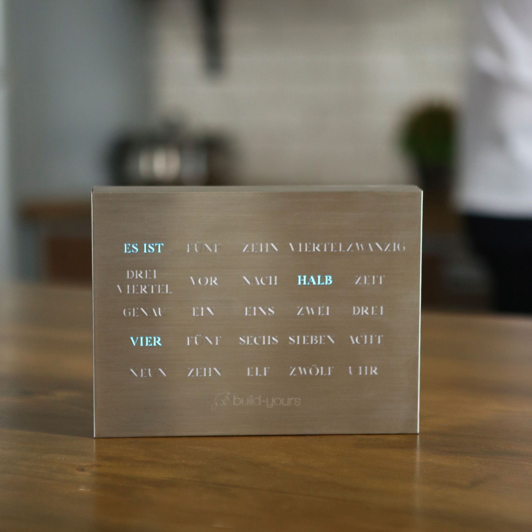 BoxClock Edelstahl - Die Wortuhr für den Schreibtisch - LED Tischuhr - Standuhr