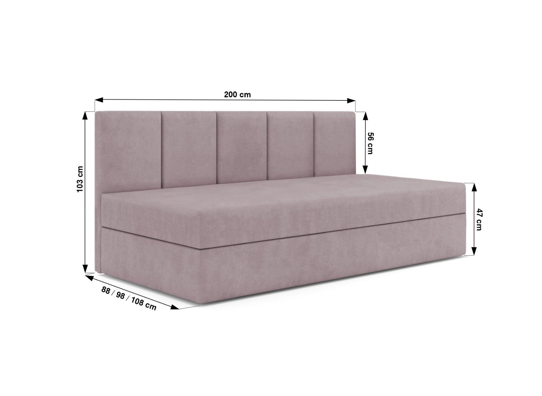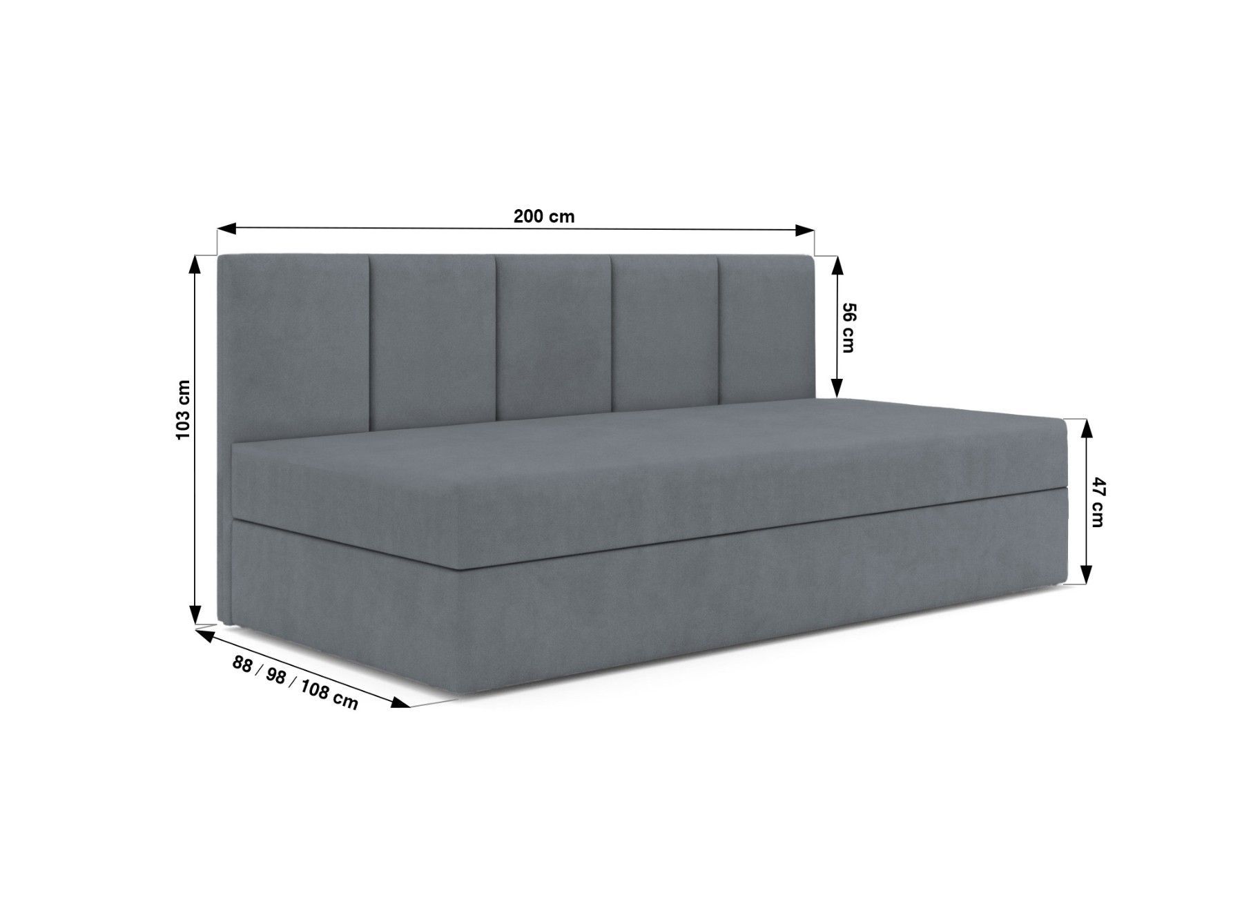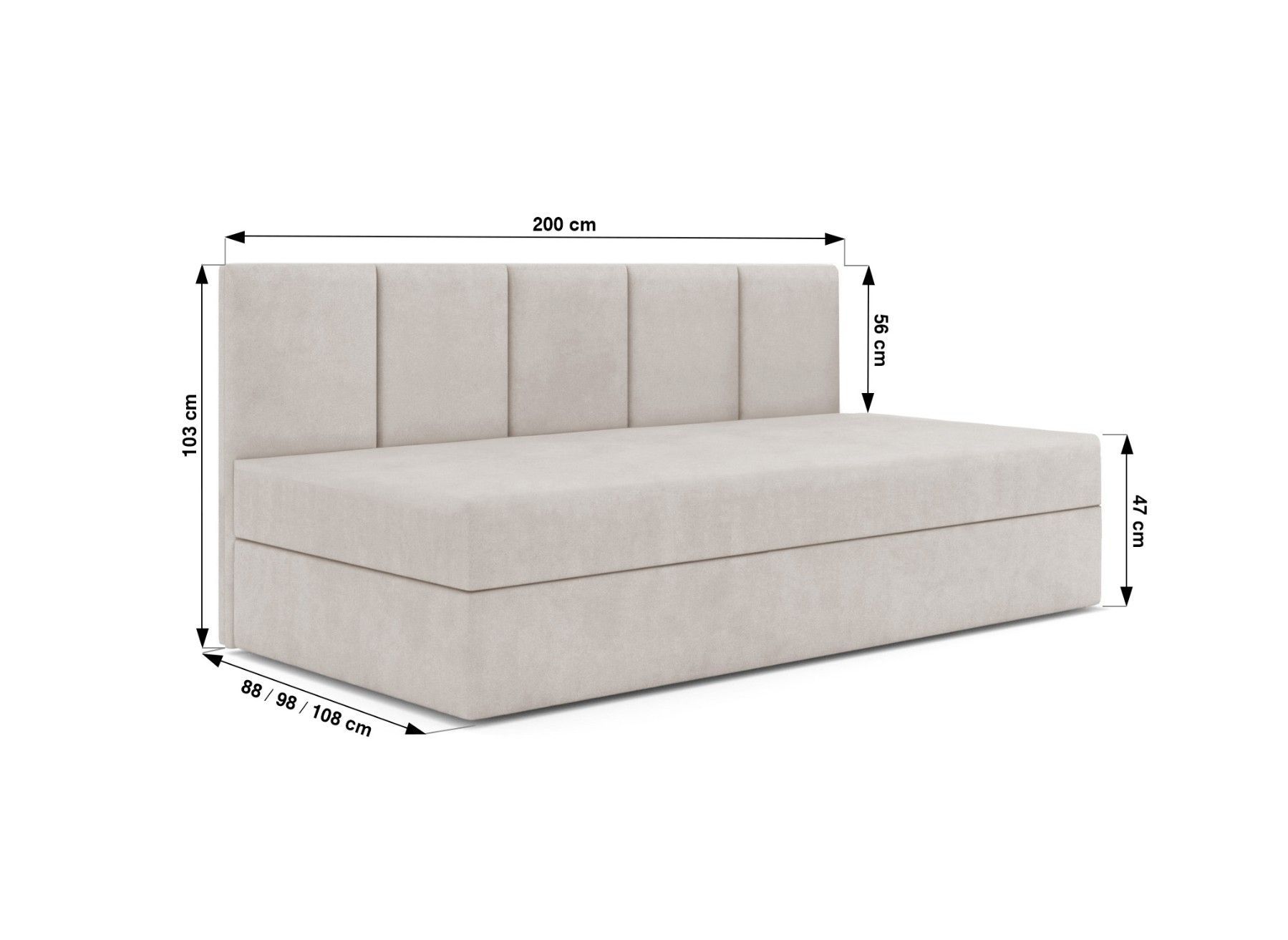 Boxspringbett ARON Das ARON Boxspringbett bietet eine großzügige Liegefläche mit Maßen von wahlweise 80x200 cm, 90x200 cm oder 100x200 cm. Die Höhe der Schlaffläche beträgt angenehme 47 cm, während das seitliche Paneel eine Höhe von 103 cm aufweist. Mit einer Länge von 200 cm bietet das Bett ausreic