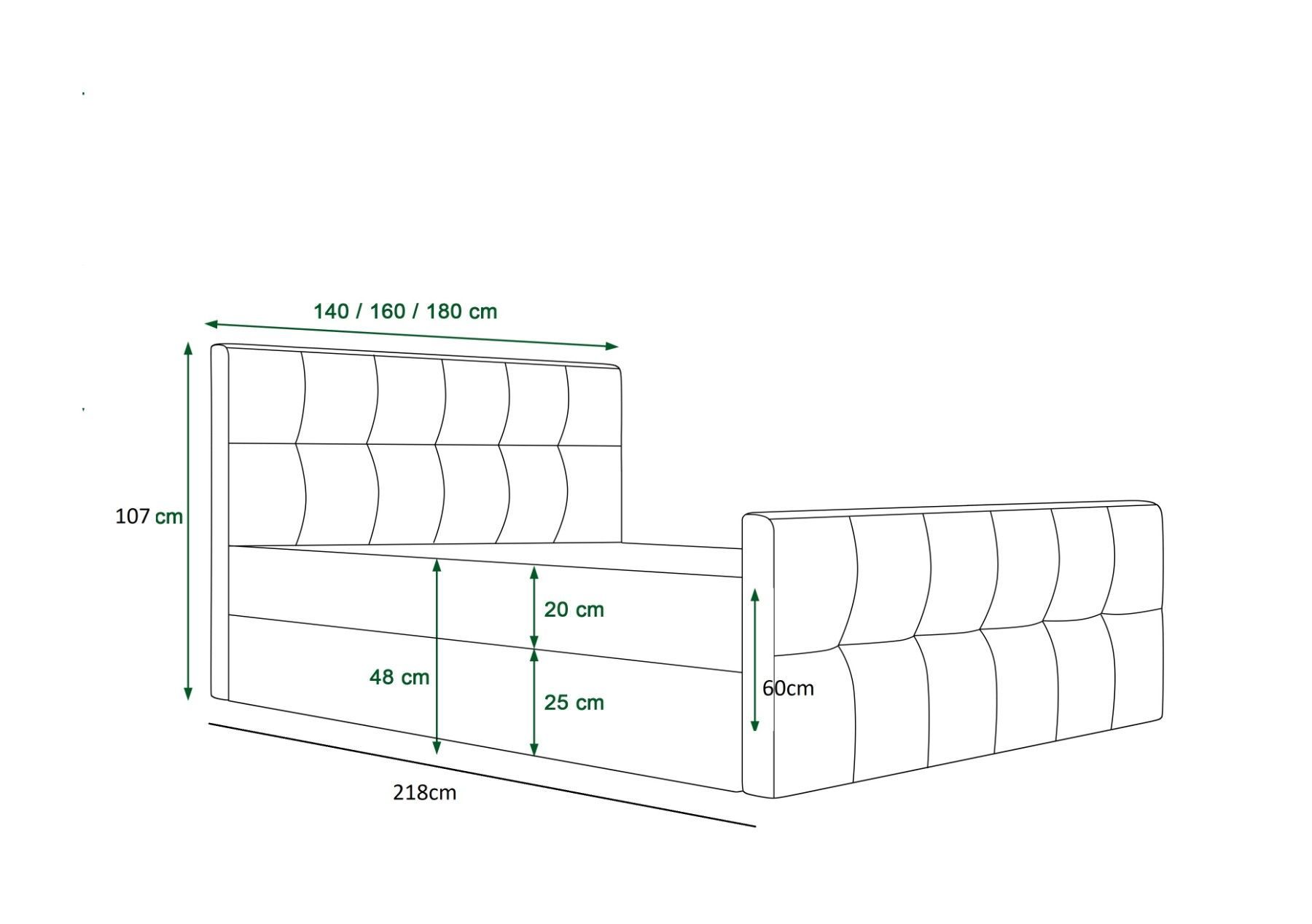 Boxspringbett HANNA Gesamtabmessungen: Schlaffläche: 140/160/180x200 cm Breite: 140/ 160/ 180 cm Sitztiefe: 218 cm Rückenlehne: 107 cm Fußteil: 60 cm Schlafhöhe mit Topper: 50 cm Schlafhöhe ohne Topper: 45 cm 2x Bettwäschebehälter Schlaffunktion Automatik auf Federn zum einfachen Öffnen des Behälters Modell in vielen verschiedenen Farben erhältlich Bettkasten: JA (Seitliche Öffnung mit automatischer Öffnungshilfe) Matratze: JA (Härte H3) Topper: JA