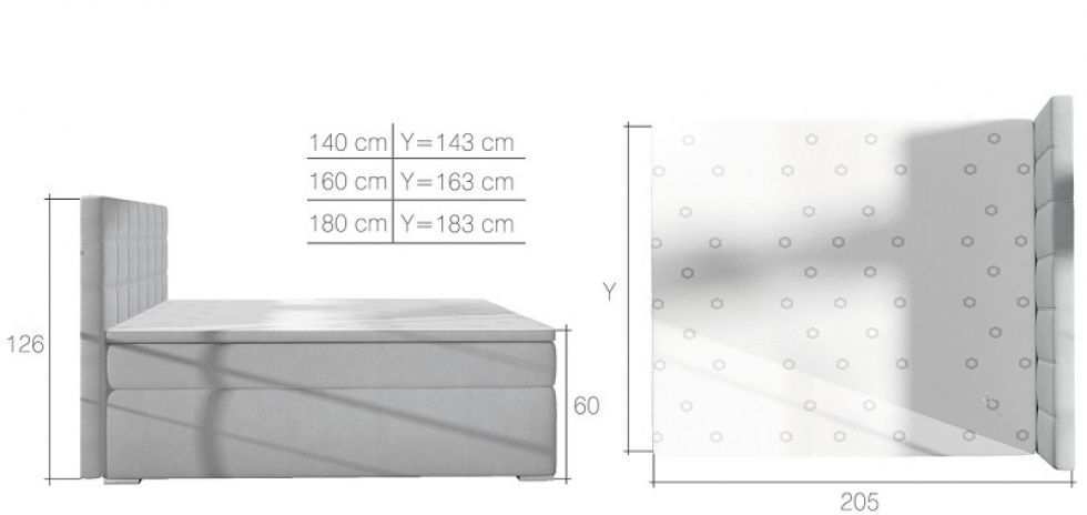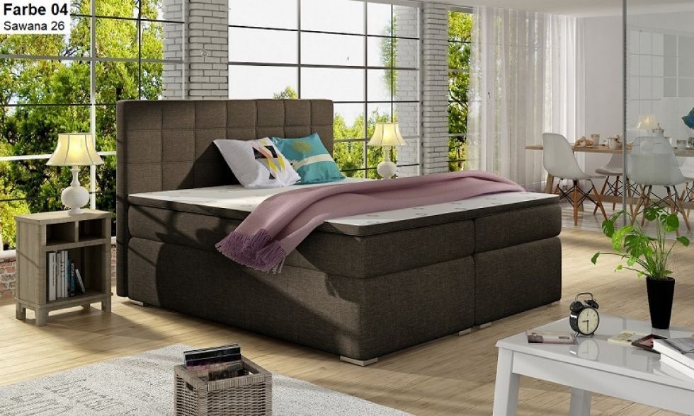 Boxspringbett AIDA 180x200 mit 2 Bettkästen Maße: Länge - 205 cm Breite - 183cm Gesamthöhe - 126 cm Höhe der Liegefläche - 60 cm Produktdetails - Liegefläche: 200 x 180cm - stabiles Untergestell bestehend aus 2 Boxen - mit 2 Bonellfedelkern-Matratzen (Härte H3) - Umrandungen der Matratzen sind mit M
