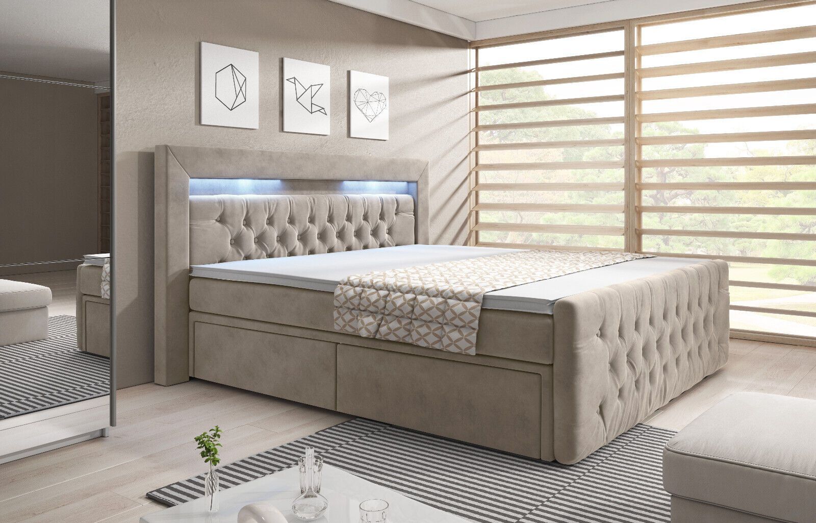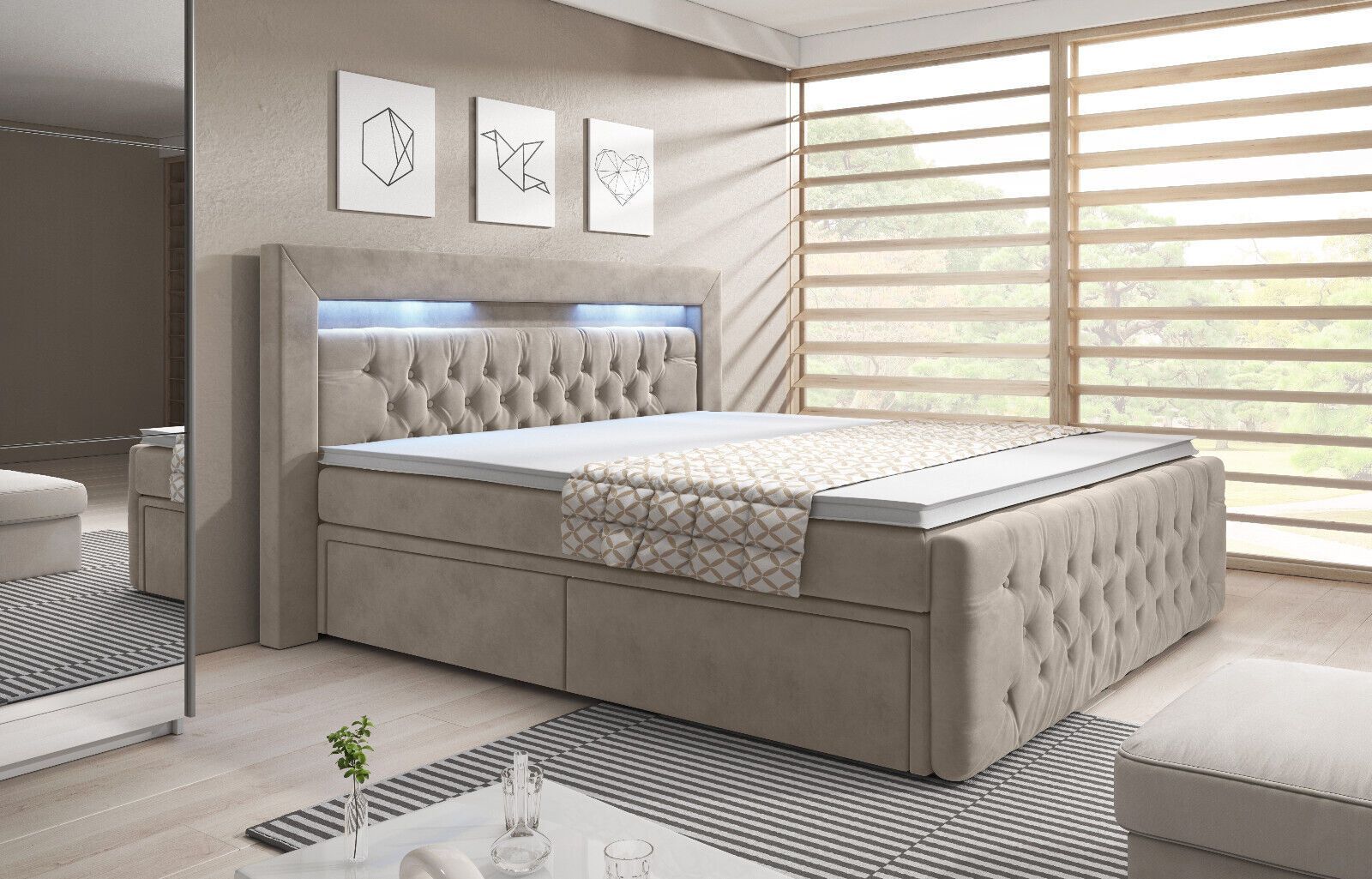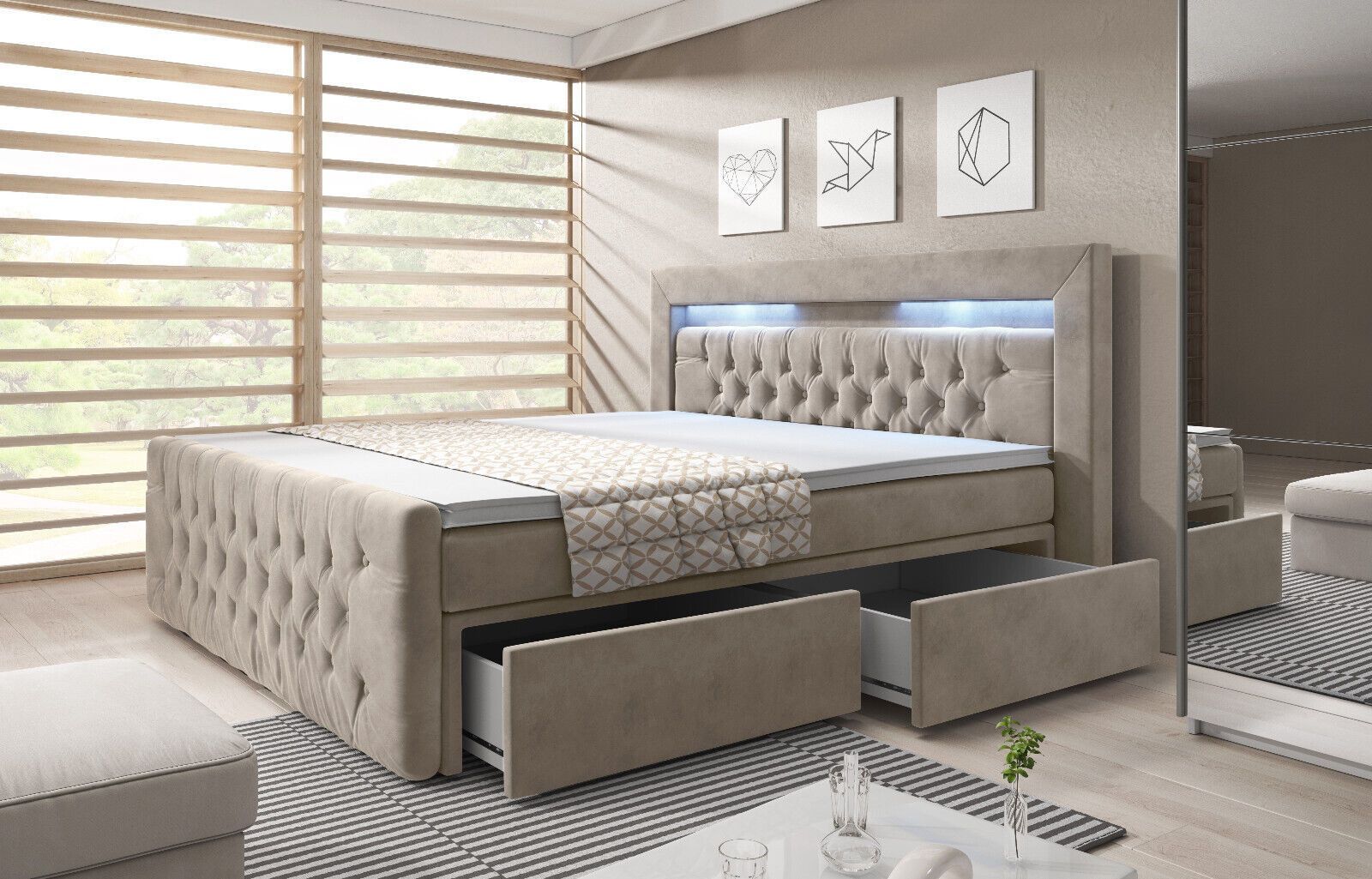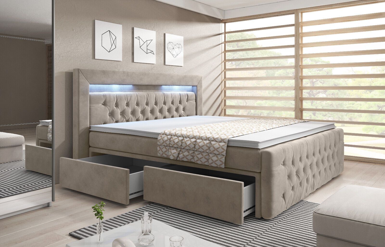 Boxspringbett „PRINCESSE BEIGE“ mit LED 2 Schubladen TOPPER BONELL Matratze SAMT