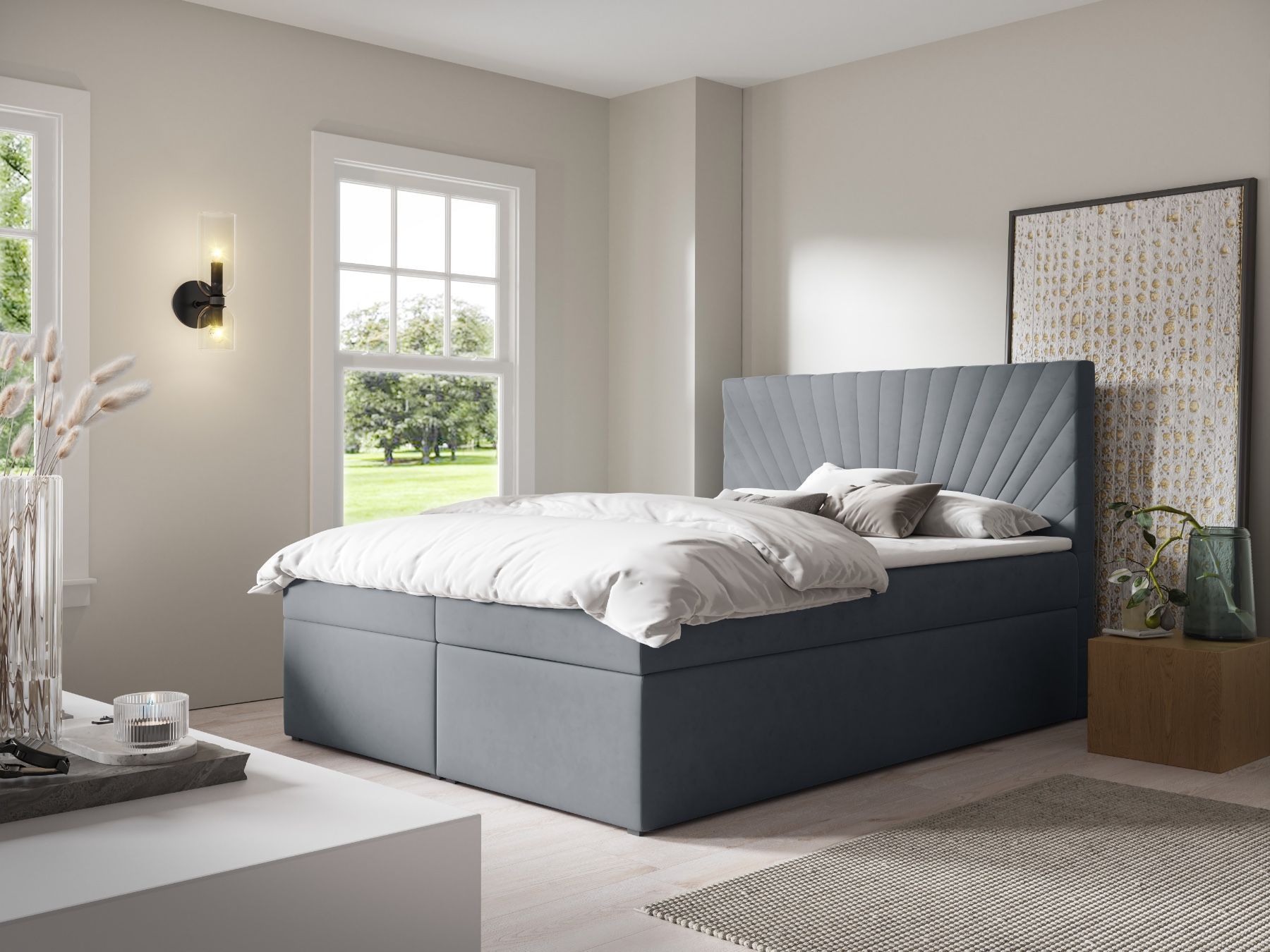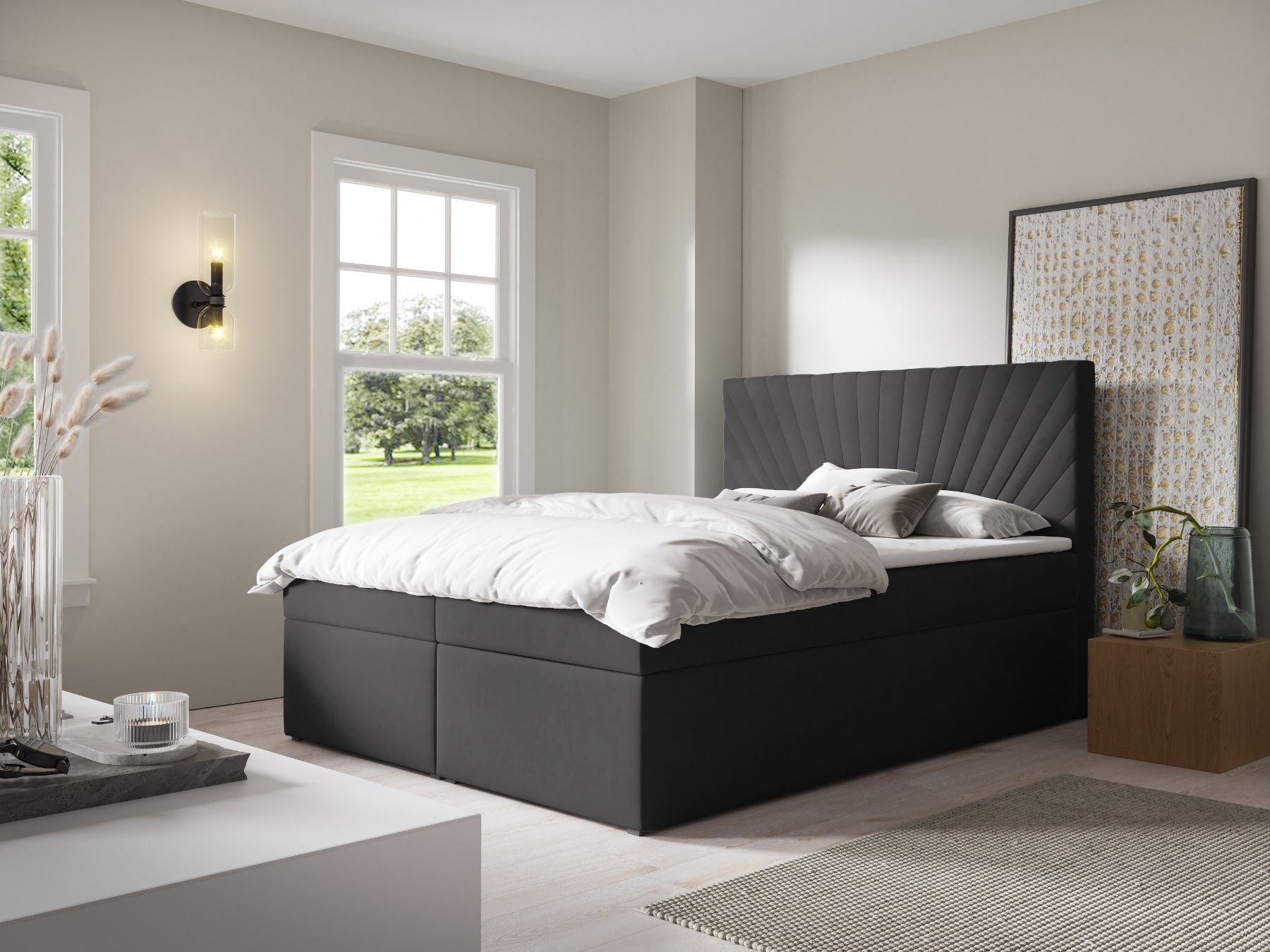 Funktionales und komfortables Kontinentalbett, erhältlich in verschiedenen Größen und Farben. - Bett im Standard mit zwei Bettkästen für die Bettwäsche auf beiden Seiten des Bettes (Der geräumige Bettkasten mit hohem Fassungsvermögen bietet genügend Platz für Bettdecken, Kissen oder andere Textilien