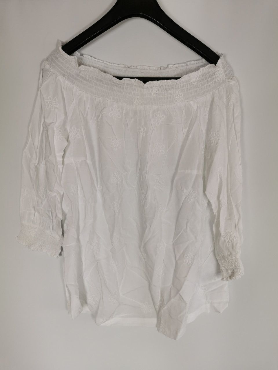 bpc bonprix Carmenbluse mit dezenter Stickerei, 3/4-Arm, weiss, Gr. 44