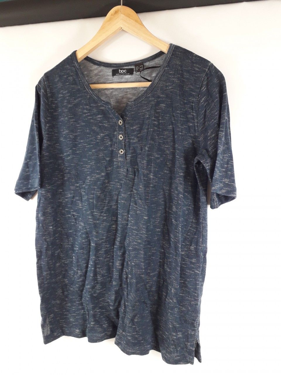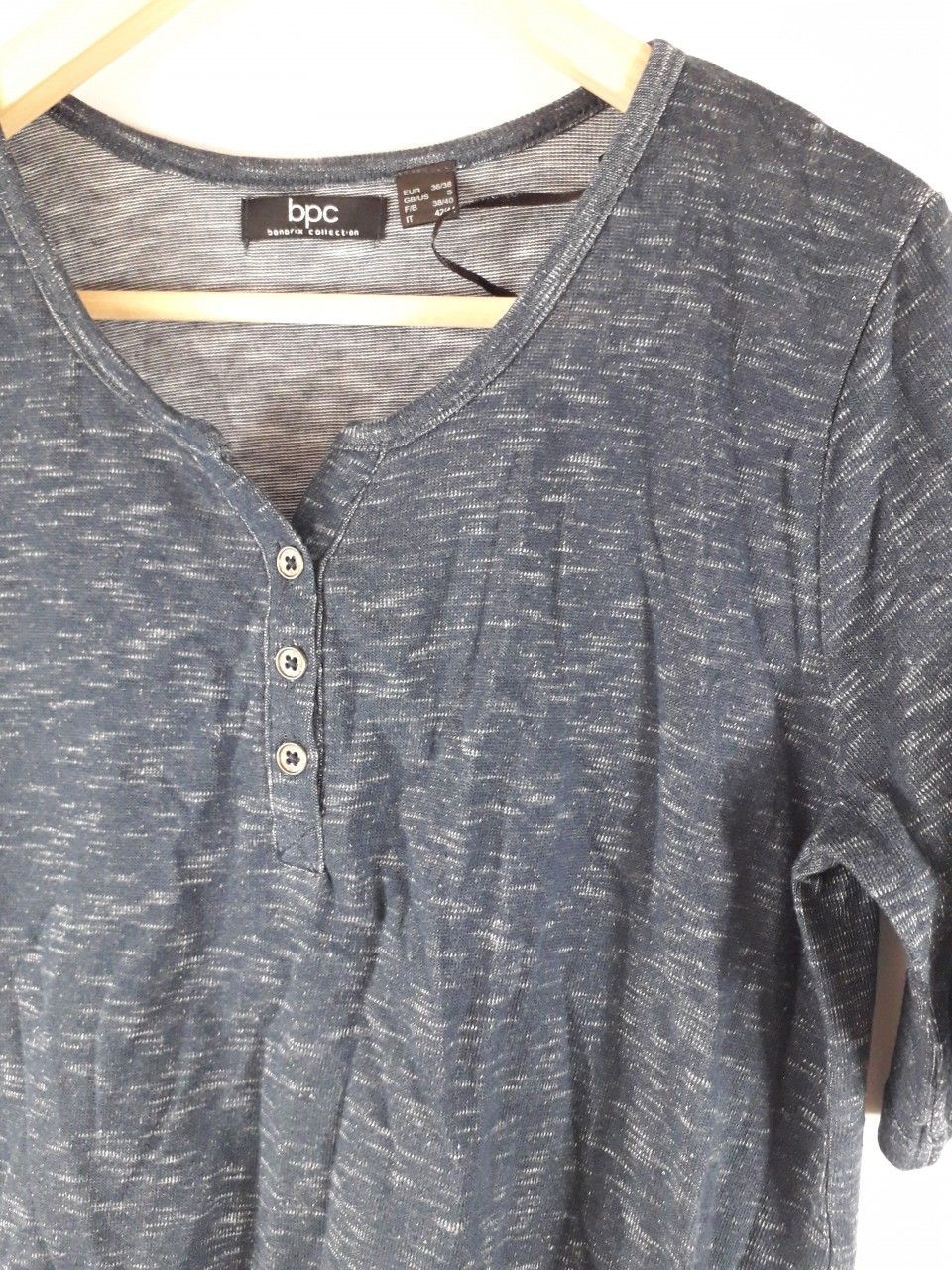 bpc bonprix Shirt mit Knopfleiste, dunkelblau Melange Gr. 36 38 Achsel zu Achsel: ca. 48cm Länge: ca. 67cm Materialzusammensetzung: 50% Baumwolle, 50% Polyester Artikel stammt aus einer Kundenretoure - Neu oder evtl. bereits getragen