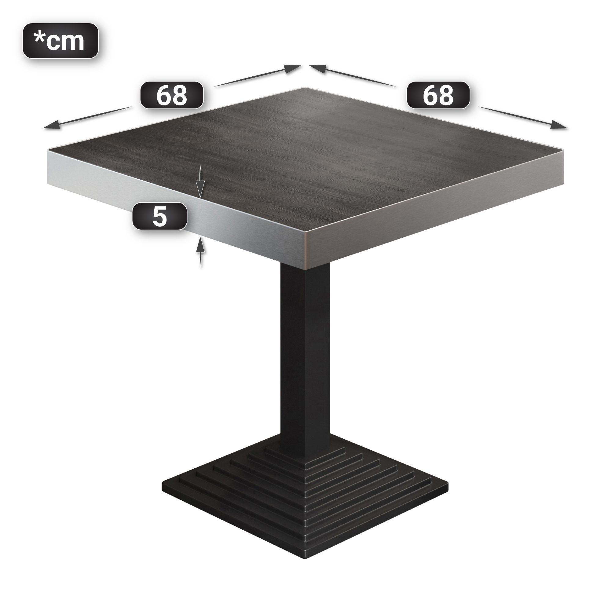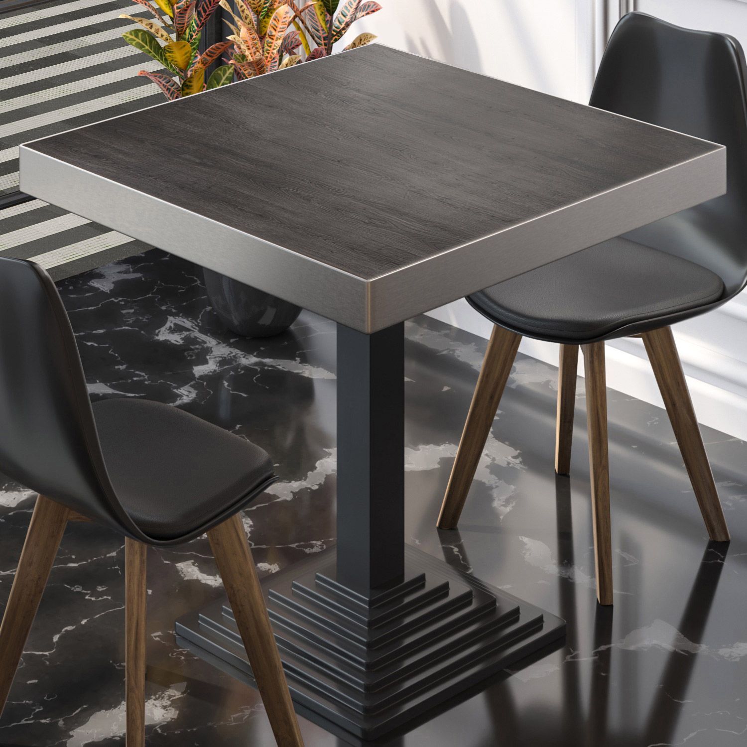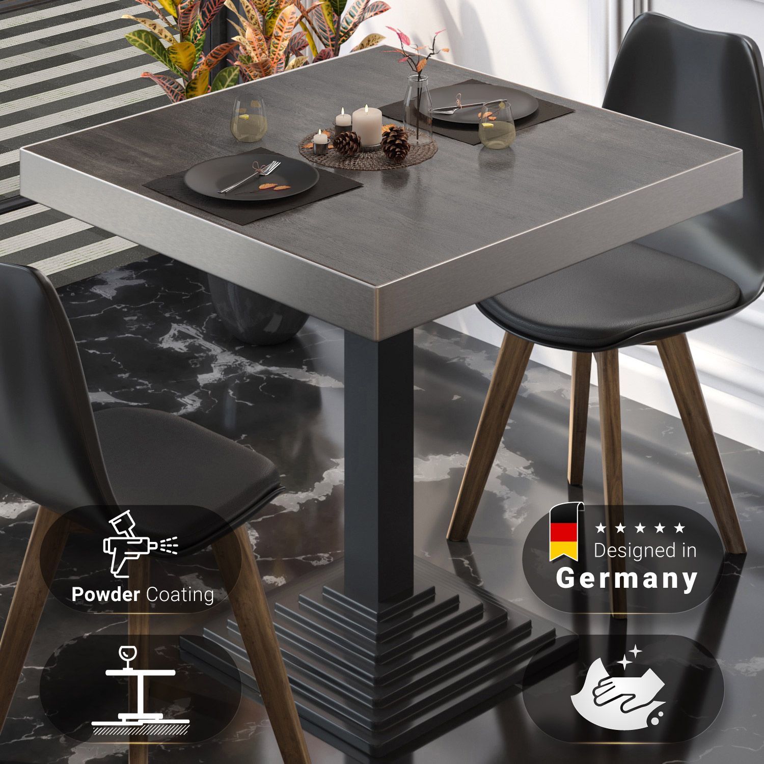 BPY | Bistro Tisch | 70 x 70 x 81 cm | Quadratisch | Edelstahl Rand | Wenge / Schwar