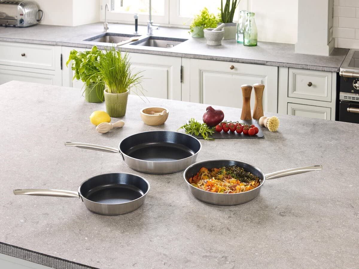 Brabantia Santiago Pfannenset Induktion 3-teilig Edelstahl Antihaft-Pfannen Set (28 cm + 24 cm + 20 cm), Backofenfest, Spülmaschinenfest Produktmerkmale: Hochwertiger Edelstahl: Die Pfannen bestehen aus strapazierfähigem und langlebigem Edelstahl, der eine gleichmäßige Wärmeverteilung gewährleistet.