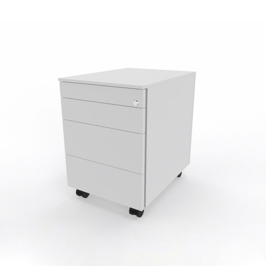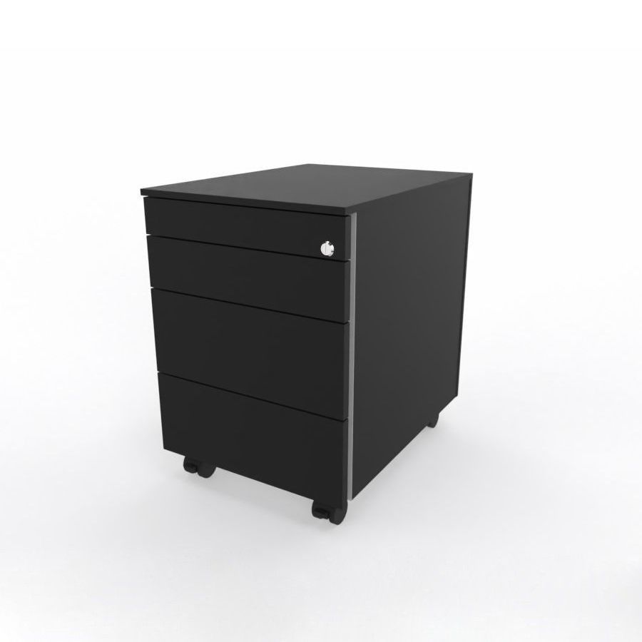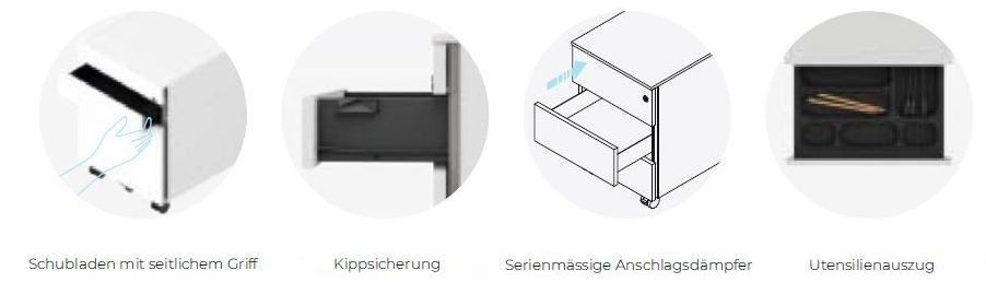 Wir sind Ihr Partner für hochwertige Büroeinrichtung Rollcontainer mit Schloss, mit 3 Schubladen und 1 Fach für Schreibmaterial Platzmangel auf dem Schreibtisch – immer wieder ein Thema im Arbeitsleben. Der Melamin-Rollcontainer ist mit 4 Schubladen der perfekte Begleiter, um Ihre Arbeitsunter