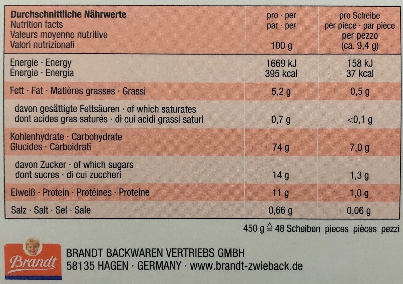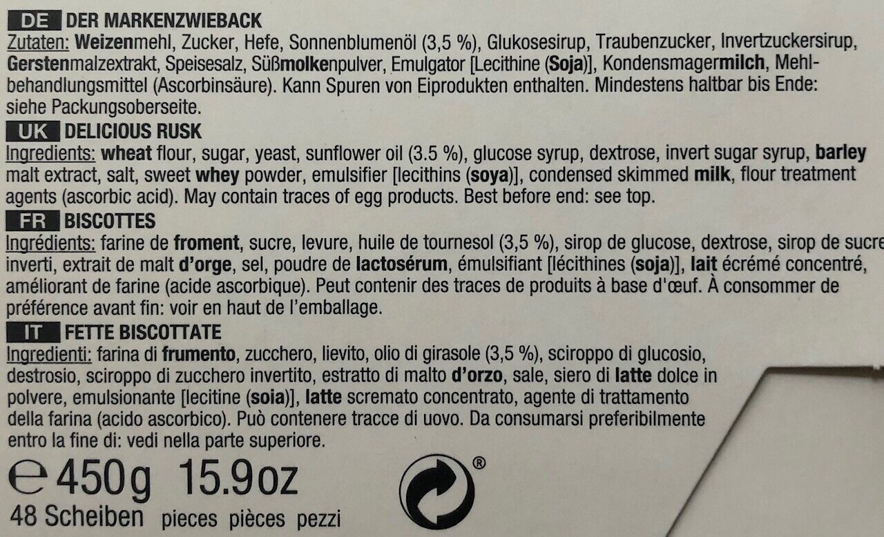 Bezeichnung des Lebensmittels Der Markenzwieback Verzeichnis der Zutaten Zutaten: WEIZENmehl, Zucker, Hefe, Sonnenblumenöl (3,5 %), Glukosesirup,Traubenzucker, Invertzuckersirup, GERSTENmalzextrakt, Speisesalz,SüßMOLKENpulver, Emulgator [Lecithine (SOJA)], KondensmagerMILCH,Mehlbehandlungsmittel (As... Mehr