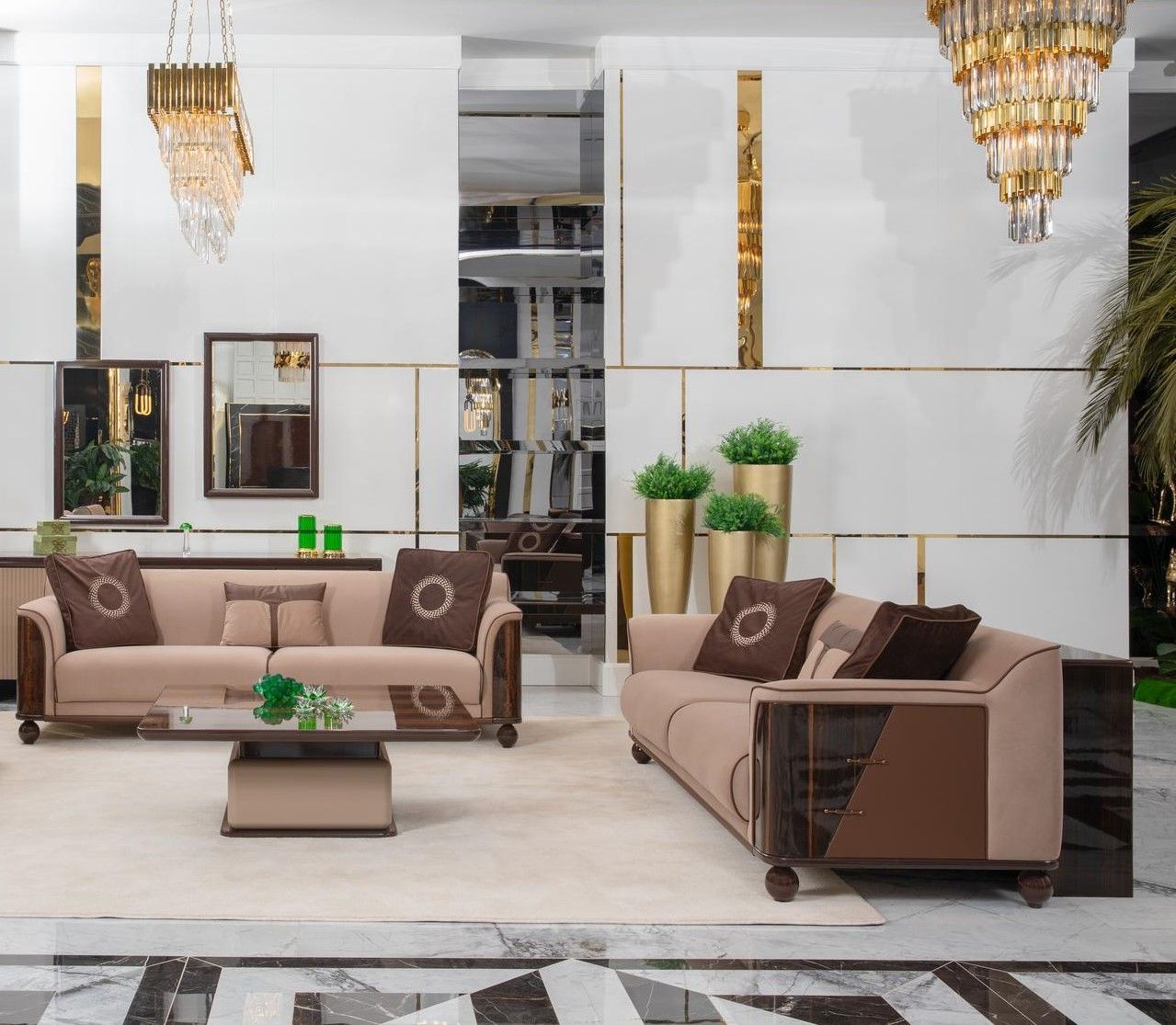 Braun-Beige Wohnzimmer Textilgarnitur Designer Holz Beistelltische