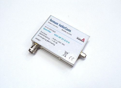 BRAUN TELECOM Bandsperrfiltermodul KDG NIF 87-518 N Zum Sperren von Fernseh- und Radio-Frequenzen Durchlassbereich: 0 - 65 MHz + 542 - 862 MHz (K30-K69) Durchgangsdämpfung: < 2,0 dB (5 - 65 MHz); < 3,0 dB (542 - 862 MHz) Sperrbereich: 87,5 - 510 MHz (FM-K26) Sperrtiefe: > 50 dB (87,5 - 510