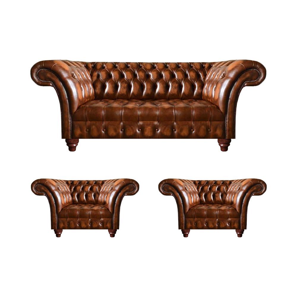 Braune Wohnzimmer Chesterfield Garnitur 2x Ledersessel Edler Dreisitzer