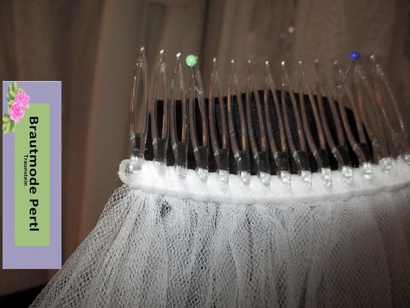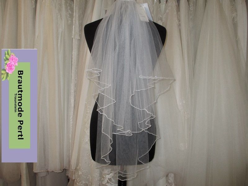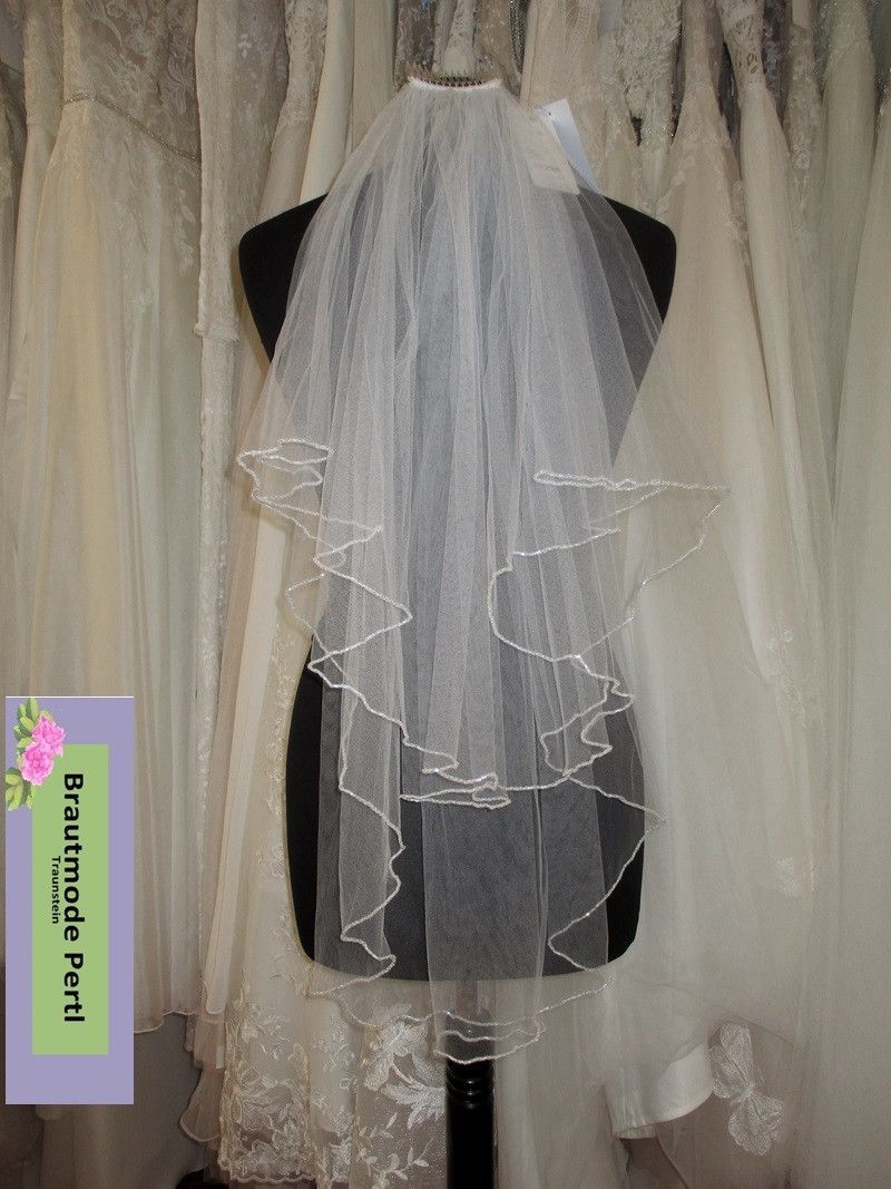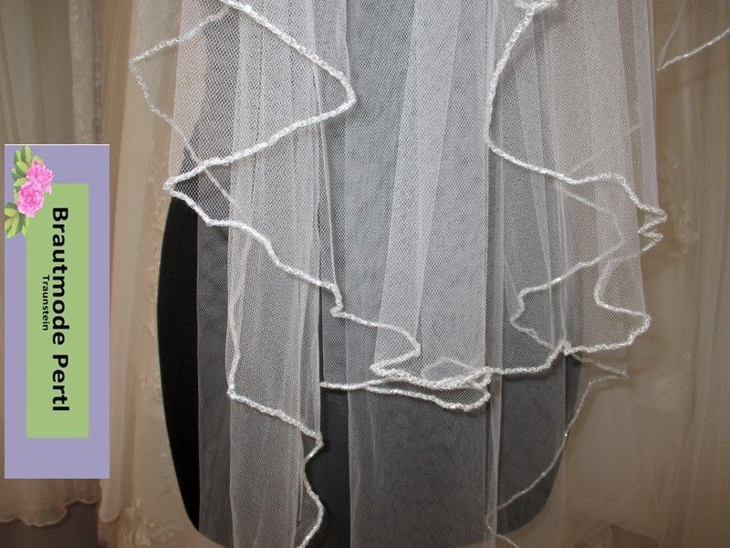 Braut Schleier mit Perlenkante weiß S-108 Diamond fertig auf Kamm Bianco Evento doppellagig ca.80 cm lang