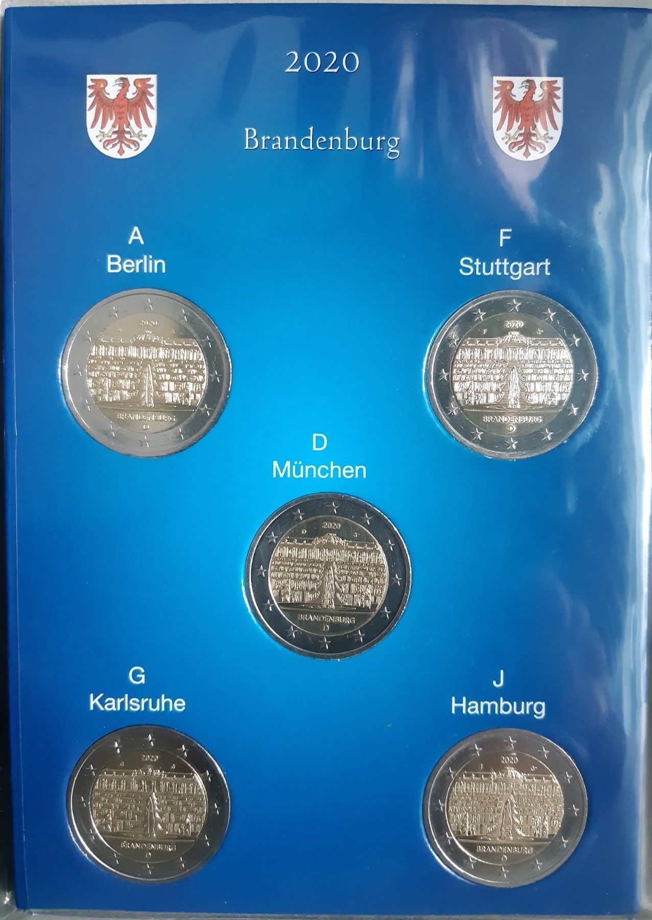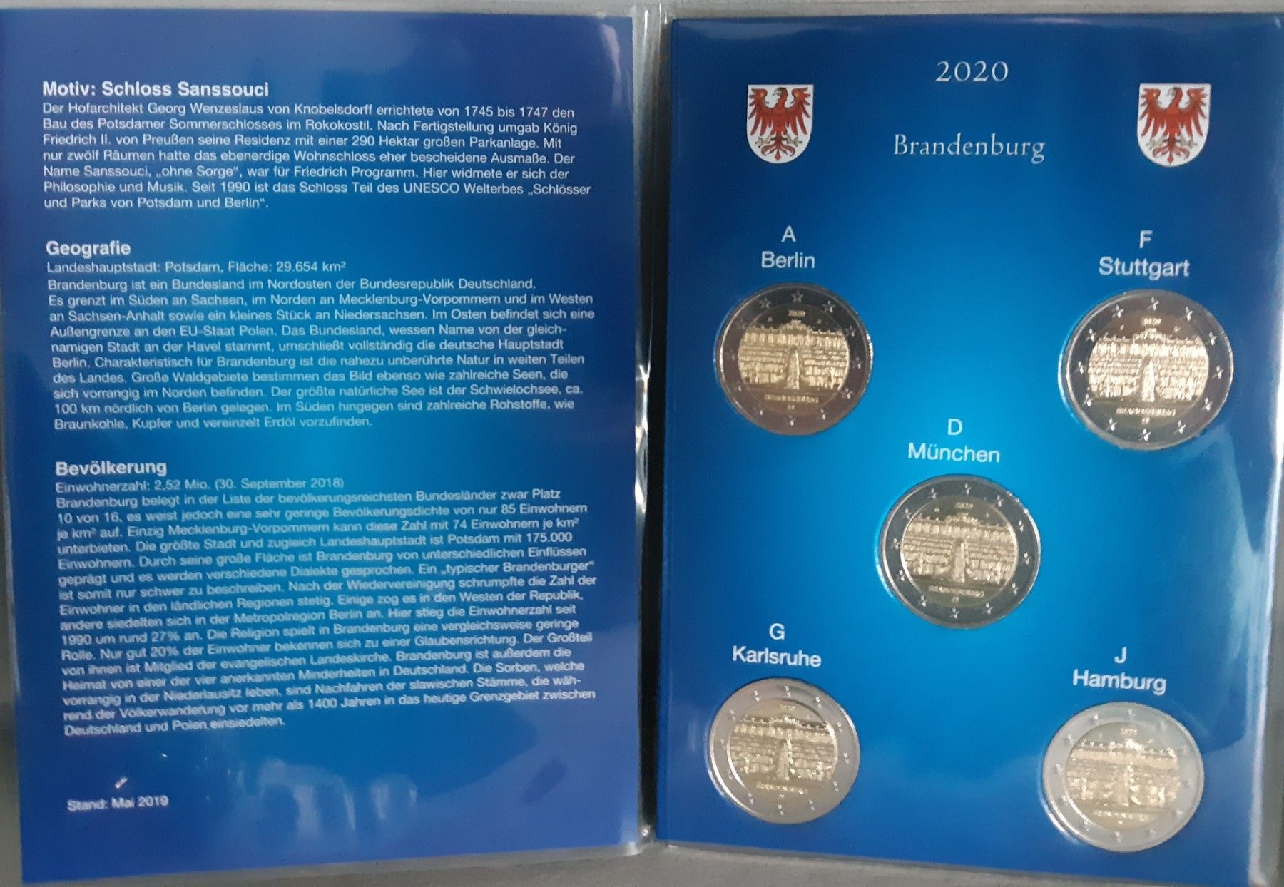 BRD 2 EURO BRANDENBURG SCHLOSS SANSSOUCI 2020 KOMPLETTSATZ; Umlaufmünze von dem Künstler Jordi Truxa aus Neuenhagen kaum zirkuliert