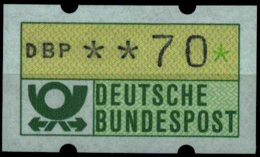 BRD ATM 1981 Nr 1-1-070R postfrisch 070 Pfg Wert aus der 1. ATM Ausgabe von 1981 - Enblem der Deutschen Bundespost mit rückseitiger Nummer 0.71€ incl. MwSt: Differenzbesteuert zzgl. Versandkosten Bestell-Nr.: S4AF8A2 Katalog-Nr: MICHEL (ATM 1-1-070R) Katalogpreis: 2,25 EUR Qualität: Normal Erha
