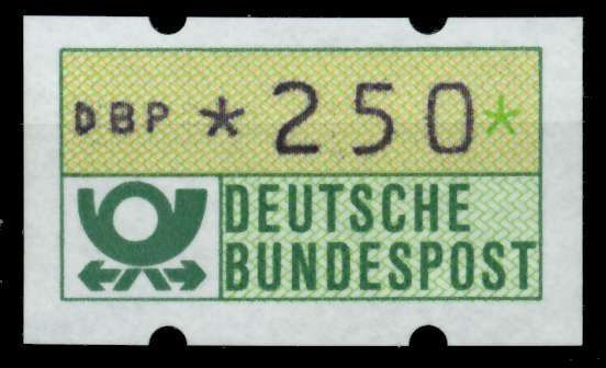 BRD ATM 1981 Nr 1-1-250 postfrisch 250 Pfg Wert aus der 1. ATM Ausgabe von 1981 - Enblem der Deutschen Bundespost 1.04€ incl. MwSt: Differenzbesteuert zzgl. Versandkosten Bestell-Nr.: 6C9D3E Katalog-Nr: MICHEL (ATM 1-1-250) Katalogpreis: 3,85 EUR Qualität: Normal Erhaltung: Postfrisch ** Einhei