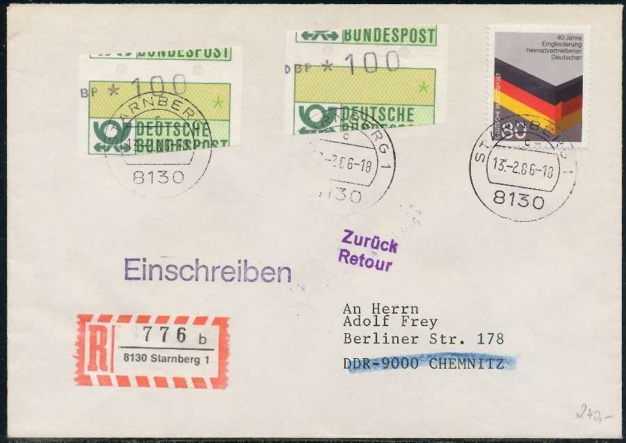 BRD ATM1-100 BRIEF MIF STARNBERGER SPRINGER Einschreiben mit ATM1-100 (2 mal), sogenannter Starnberger Reiter bzw. Starnberger Springer , beiliegend der Einlieferungsschein und Quittung des Automaten mit Datum 13.02.1986 21.18€ incl. MwSt: Differenzbesteuert zzgl. Versandkosten Bestell-Nr.: 7E4