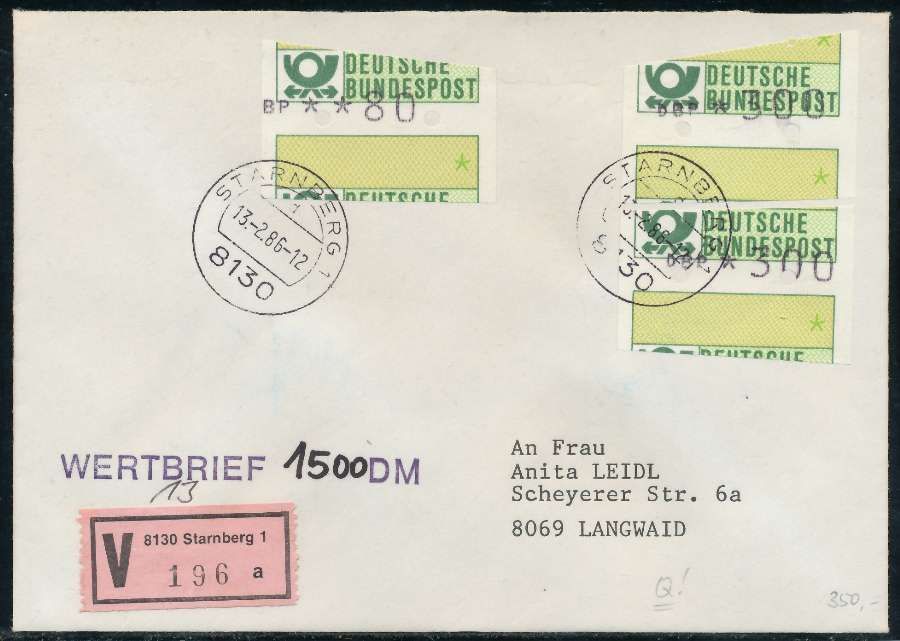 BRD ATM1-190 BRIEF MIF STARNBERGER SPRINGER Versiegelter Wertbrief 1500 DM mit ATM1-300 und 080, sogenannter Starnberger Reiter bzw. Starnberger Springer , beiliegend der Einlieferungsschein und Quittung des Automaten mit Datum 13.02.1986 23.61€ incl. MwSt: Differenzbesteuert zzgl. Versandkoste