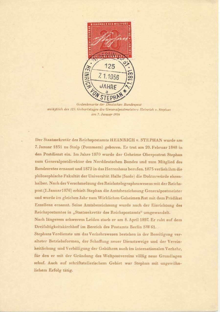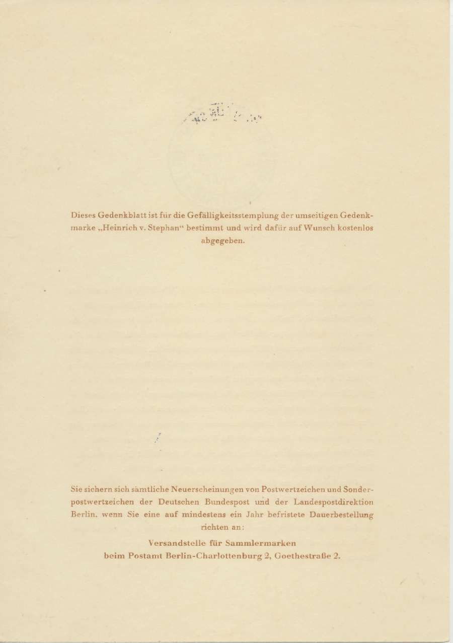 BRD BERLIN Nr 227 ETB1 ERSTTAGSBLATT 20 Pfg Wert aus der Ausgabe 125. Geburtstag von Heinrich von Stephan, Ersttagsblatt Berlin Vorläufer-Ausgabe, Erhaltung einwandfrei 108.01€ incl. MwSt: Differenzbesteuert zzgl. Versandkosten Bestell-Nr.: 92FC62 Katalog-Nr: MICHEL (227 ETB1) Katalogpreis: 300