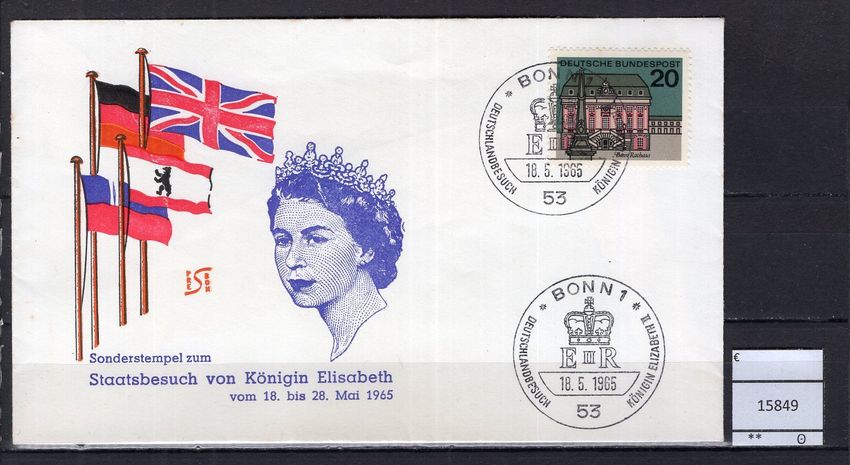 BRD Bund 1965 Sonderbeleg Staatsbesuch Königin Elisabeth Sonderbeleg mit MiNr. 424 Sonderstempel Bonn Michelkatalogpreis -€ Ich löse meine umfangreiche Briefmarkensammlung auf. Beim Kauf mehrer Artikel zahlen Sie nur die tatsächlich anfallenden Versandkosten, diese richten sich nach dem Gewicht
