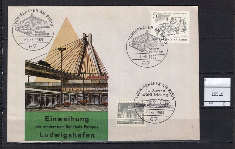 BRD Bund 1969 Sonderbeleg Einweihung Bahnhof Ludwigshafen Sonderbeleg mit Berlin MiNr. 330 Sonderstempel Ludwigshafen am Rhein Michelkatalogpreis -€ Ich löse meine umfangreiche Briefmarkensammlung auf. Beim Kauf mehrer Artikel zahlen Sie nur die tatsächlich anfallenden Versandkosten, diese rich