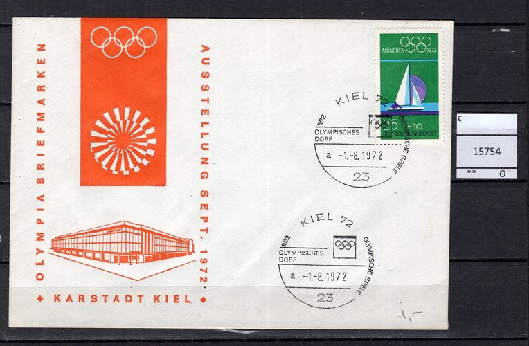 BRD Bund 1972 Sonderstempel Olympisches Dorf Sonderbeleg mit MiNr. 720 Sonderstempel Kiel Michelkatalogpreis -€ Ich löse meine umfangreiche Briefmarkensammlung auf. Beim Kauf mehrer Artikel zahlen Sie nur die tatsächlich anfallenden Versandkosten, diese richten sich nach dem Gewicht der Sendung