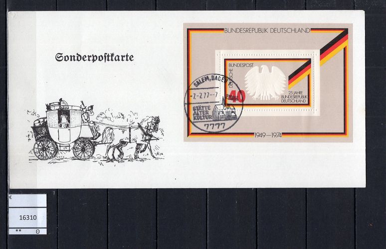 BRD Bund 1977 Sonderstempel Salem Stätte Alter Kultur Sonderpostkarte mit Blockausgabe 10 Sonderstempel Salem Michelkatalogpreis -€ Ich löse meine umfangreiche Briefmarkensammlung auf. Beim Kauf mehrer Artikel zahlen Sie nur die tatsächlich anfallenden Versandkosten, diese richten sich nach dem