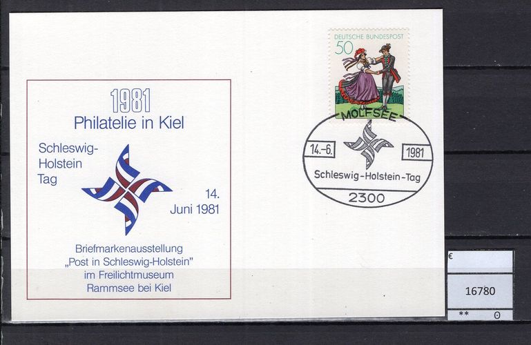 BRD Bund 1981 Sonderpostkarte Schleswig-Holstein-Tag Sonderpostkarte mit MiNr. 1096 Sonderstempel Molfsee Michelkatalogpreis -€ Ich löse meine umfangreiche Briefmarkensammlung auf. Beim Kauf mehrer Artikel zahlen Sie nur die tatsächlich anfallenden Versandkosten, diese richten sich nach dem Gew