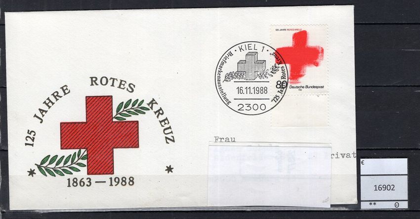 BRD Bund 1988 Ausstellungsbeleg Briefmarkenausstellung 125 Jahre Rotes Kreuz Schmuck-Beleg mit MiNr. 1387 Sonderstempel Kiel, gelaufen Michelkatalogpreis -€ Ich löse meine umfangreiche Briefmarkensammlung auf. Beim Kauf mehrer Artikel zahlen Sie nur die tatsächlich anfallenden Versandkosten, di