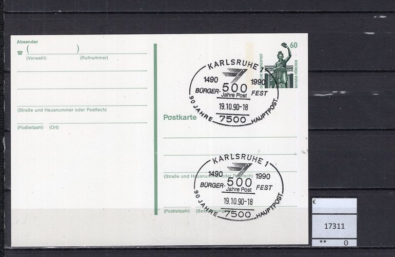 BRD Bund 1990 Sonderstempel 500 Jahre Post Ganzsache P 141 Ganzsache P 141 Sonderstempel Karlsruhe Michelkatalogpreis -€ Ich löse meine umfangreiche Briefmarkensammlung auf. Beim Kauf mehrer Artikel zahlen Sie nur die tatsächlich anfallenden Versandkosten, diese richten sich nach dem Gewicht de