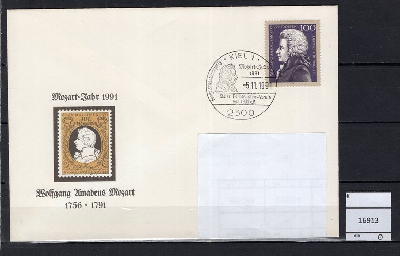 BRD Bund 1991 Sonderbeleg Mozartjahr 1991 Schmuck-Beleg mit MiNr. 1571 gestempelt Kiel, gelaufen Michelkatalogpreis -€ Ich löse meine umfangreiche Briefmarkensammlung auf. Beim Kauf mehrer Artikel zahlen Sie nur die tatsächlich anfallenden Versandkosten, diese richten sich nach dem Gewicht der