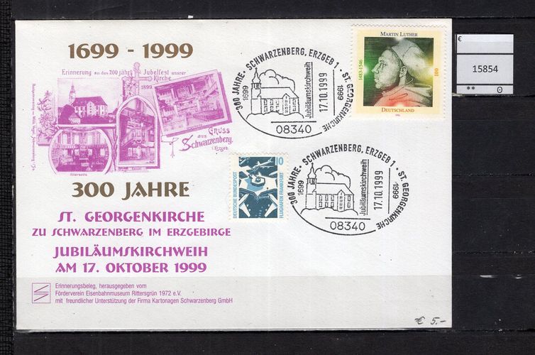 BRD Bund 1999 Gedenkbeleg 300 Jahre St. Georgenkirche Sonderbeleg mit MiNr. 1841 Sonderstempel Schwarzenberg Michelkatalogpreis -€ Ich löse meine umfangreiche Briefmarkensammlung auf. Beim Kauf mehrer Artikel zahlen Sie nur die tatsächlich anfallenden Versandkosten, diese richten sich nach dem