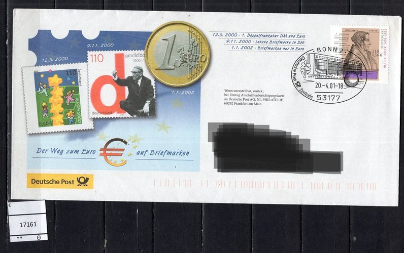 BRD / Bund 2001 Sonderbeleg DP Der Weg zum Euro in Briefmarken mit MiNr. 2169 gelaufe