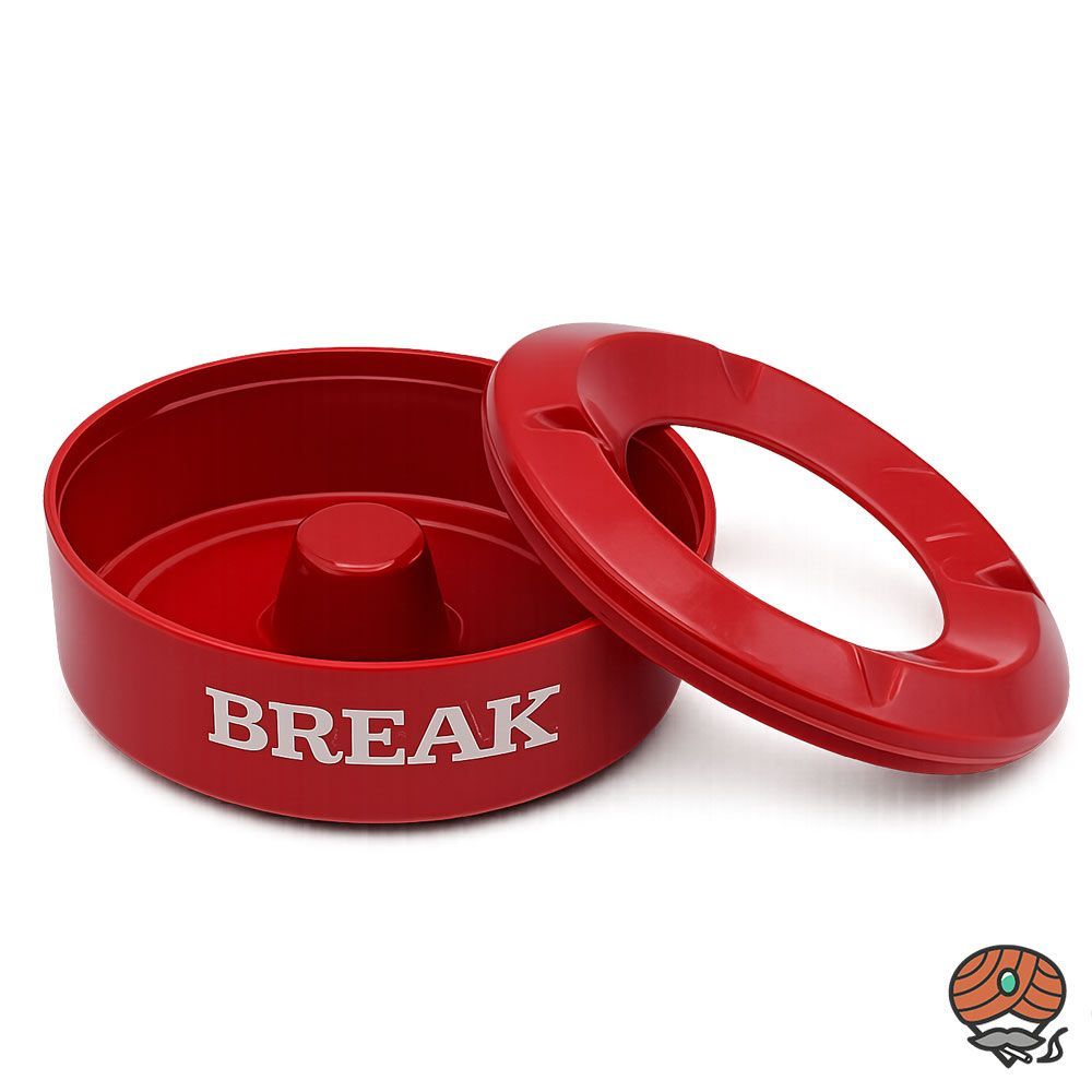 Break Aschenbecher Dieser rote Aschenbecher aus Kunststoff mit insgesamt zwei Break-Logos eignet sich sowohl für den Innen- als auch für den Außenbereich. Der Aschenbecher hat einen Durchmesser von ca. 10 cm und ist 4,5 cm hoch. Er verfügt über vier Einkerbungen zur Zigarettenablage. Der Deckel mit