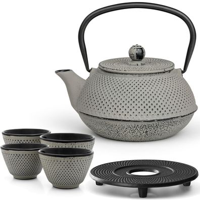 Bredemeijer Gusseisen Teekanne Set 0,8 L grau Asia Untersetzer & 4 Teebecher